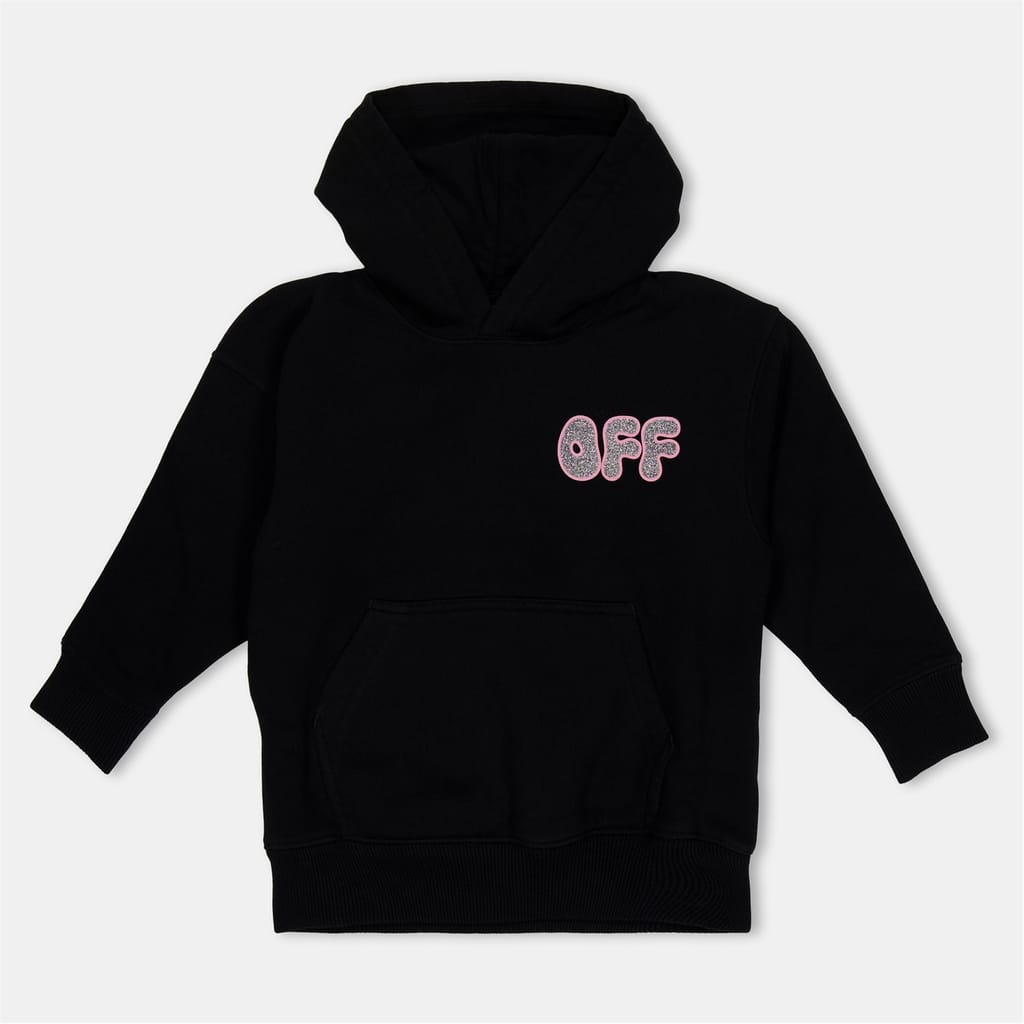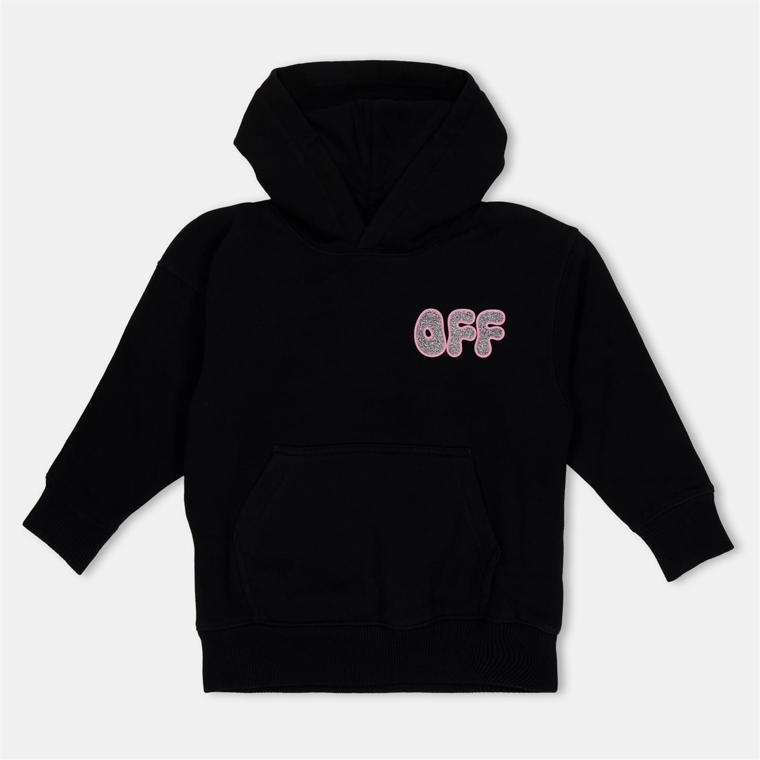 This Off White top features a hooded neck and long sleeves, offering a regular fit. The solid pattern is complemented by ribbed cuffs and a distinctive logo embellishment. A pocket adds functionality, while the lettering graphic enhances its style. -