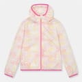 This Off-White windbreaker features a hooded neck and a relaxed fit, perfect for a casual look. The jacket is designed with a zipper closure and elasticated cuffs for added comfort. It showcases an all-over logo pattern with distinctive lettering, complemented by a straight hem. The short length adds a modern touch to this stylish piece. -