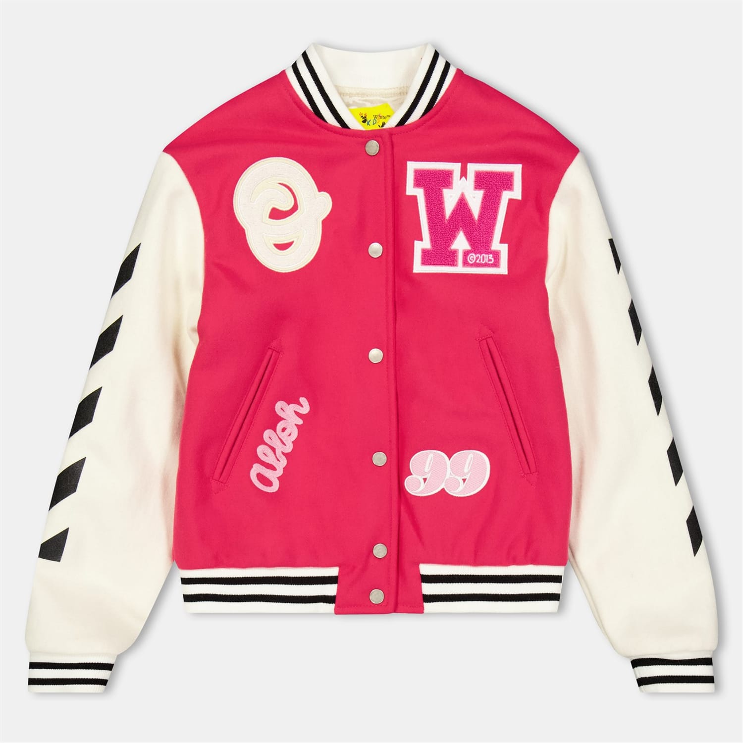 This Off-White bomber jacket is a stylish addition to your casual collection. Featuring a short length and a bomber collar, it offers a regular fit with a ribbed crew neck, cuffs, and hem. The jacket is designed with a solid pattern and includes snap and zipper closures. Embellished with a logo patch and embroidered details, it also showcases lettering and a number on the back for a distinctive look. -