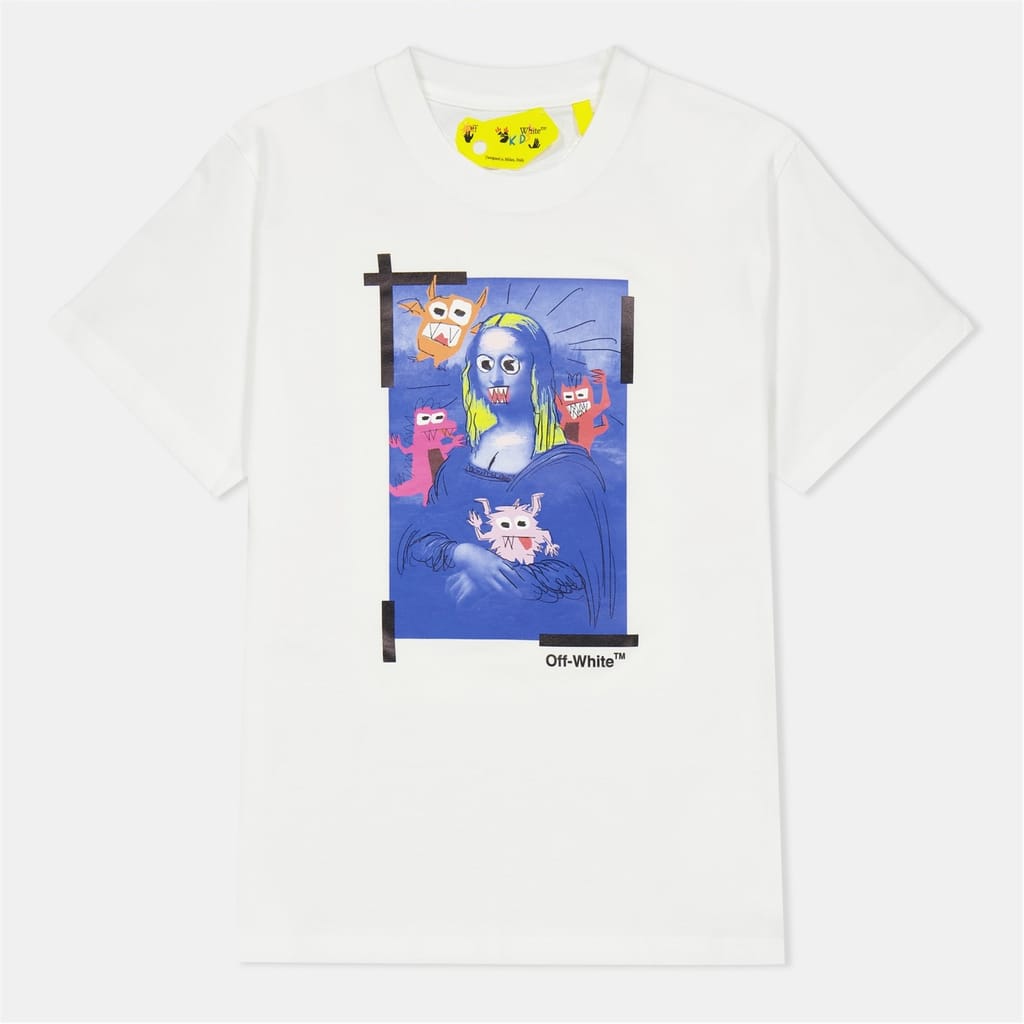 This Off White top is a casual staple featuring a regular fit and a graphic print. The short sleeves and crew neck design offer a comfortable and stylish look. The logo embellishment adds a distinctive touch, making it a versatile addition to any wardrobe. -