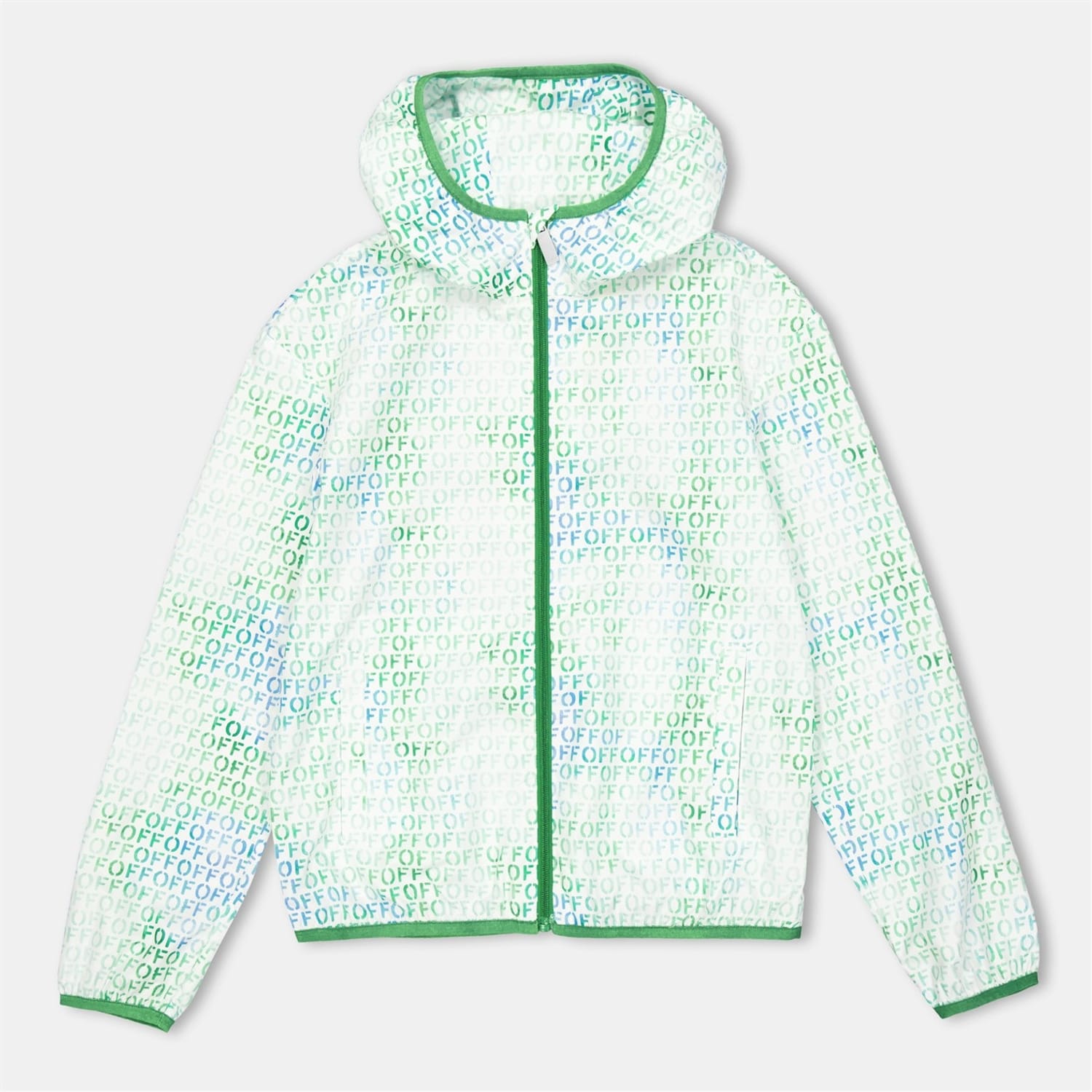 The Off-White windbreaker features a hooded design and a relaxed fit, perfect for casual outings. It includes a zipper closure and elasticated cuffs for added comfort. The straight hem complements its modern style, while the all-over logo pattern and lettering graphic add a distinctive touch. This jacket is a statement piece with its iconic logo embellishments. -