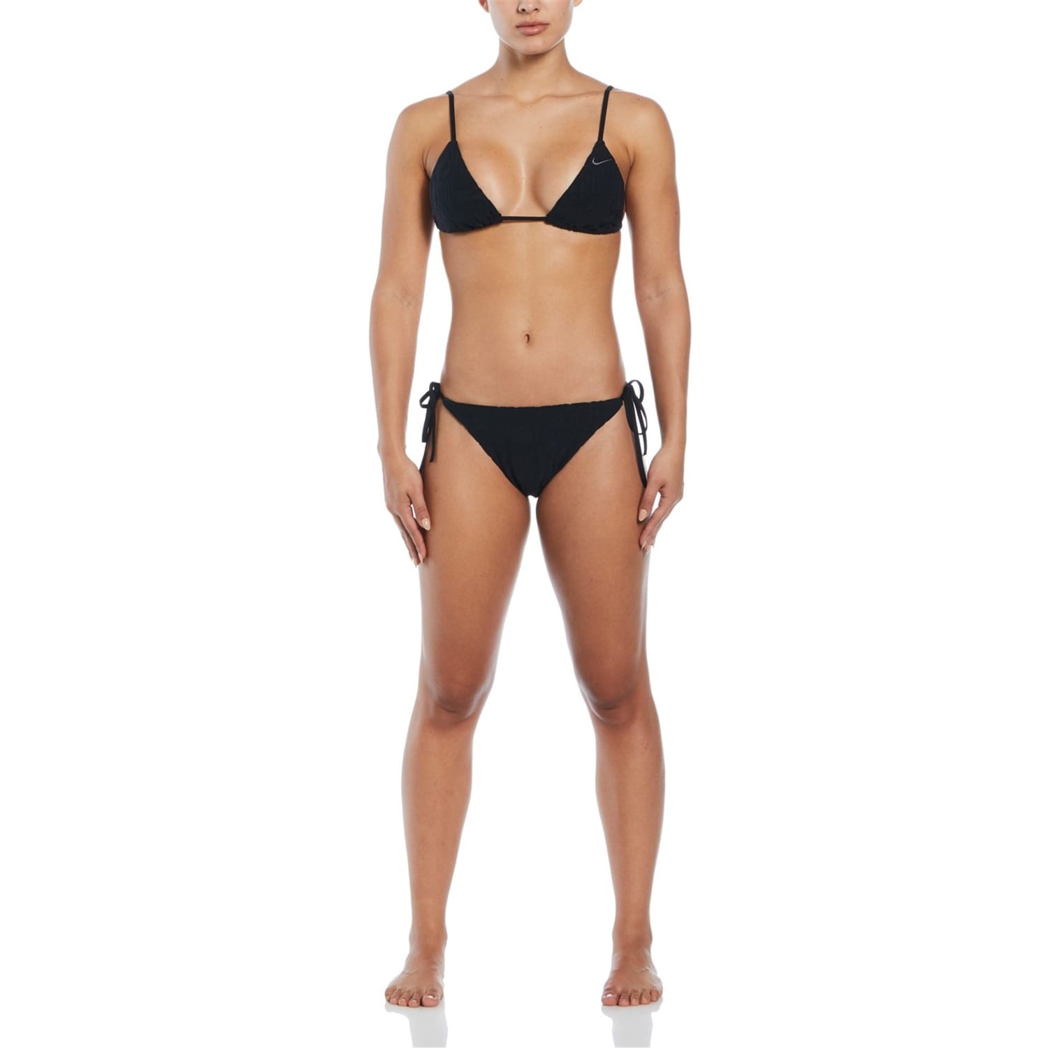 Discover the Nike swimwear collection with this stylish two-piece set. Featuring a textured pattern, the triangle bikini top offers a tie closure for a secure fit. The set is elegantly embellished with the iconic logo, adding a touch of brand recognition to your beachwear ensemble. -