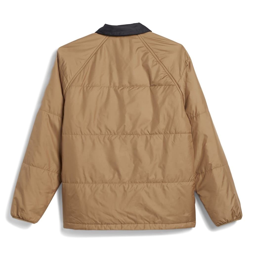 This adidas coach jacket features a relaxed fit with a shirt collar and a straight hem. The solid pattern and quilted design offer a classic look, while the zipper closure ensures practicality. The jacket is adorned with a logo embellishment, adding a touch of brand identity. -