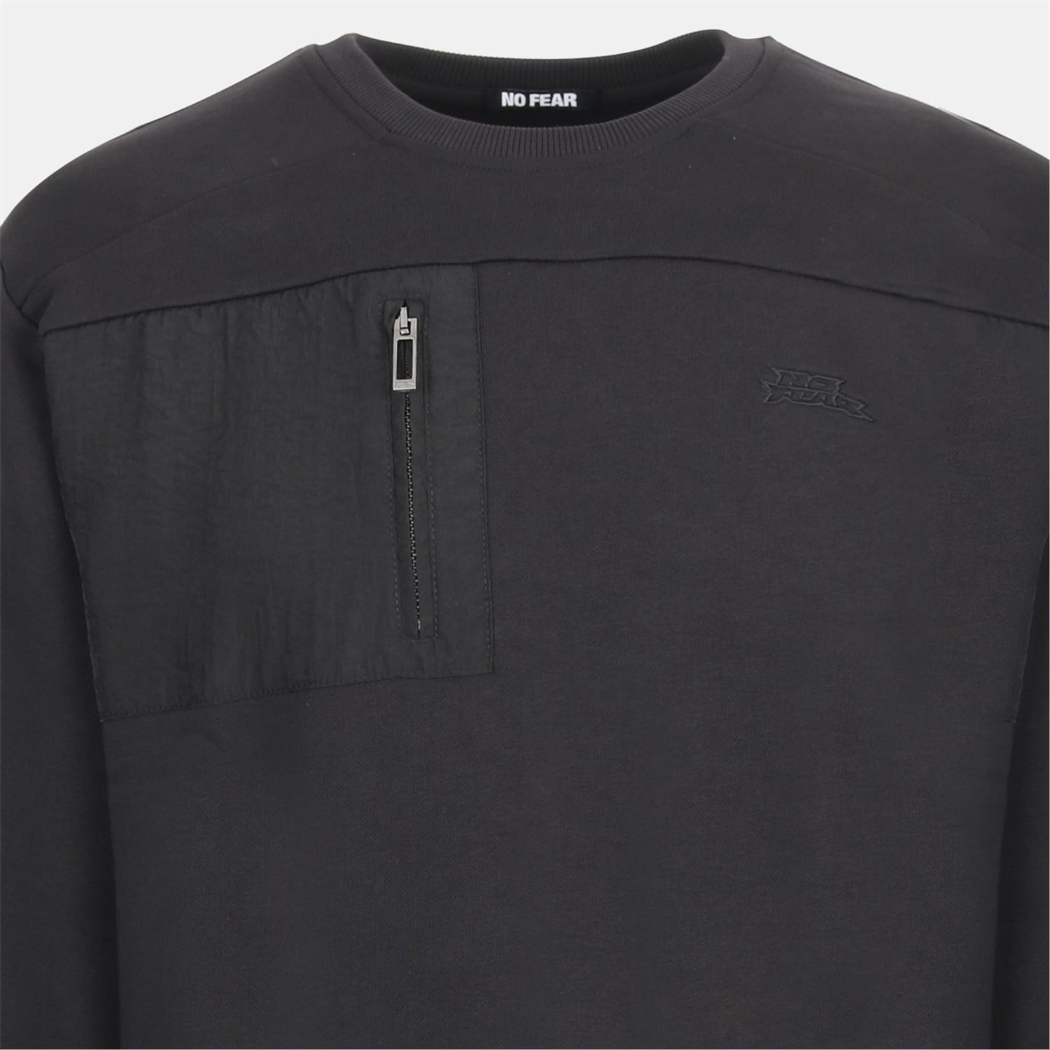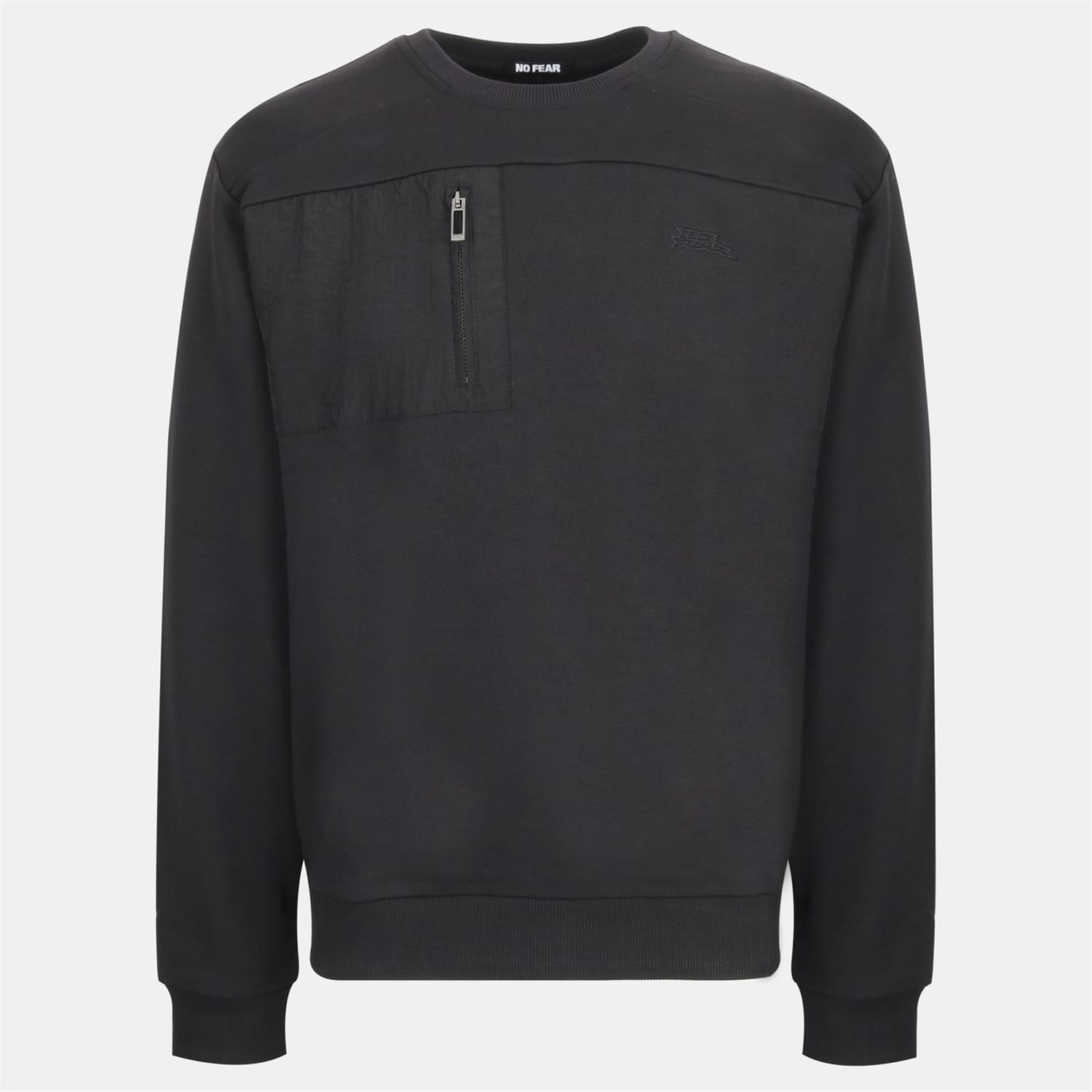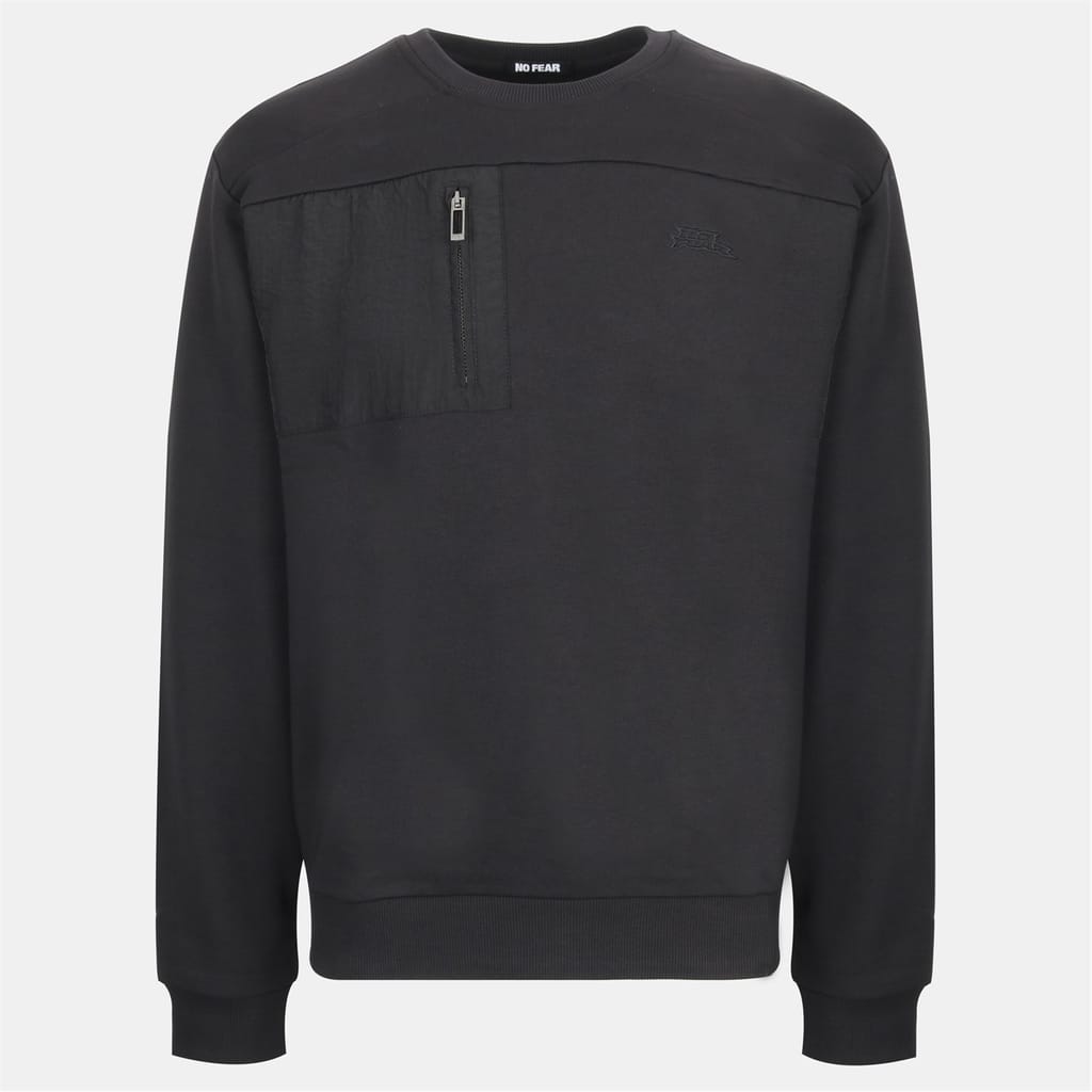 This No Fear top features a crew neck and long sleeves, offering a regular fit. The design includes a ribbed hem and ribbed cuffs for added comfort. It is adorned with a chest pocket, a single zipped pocket, and an embroidered logo. The solid pattern adds a classic touch to this versatile piece. -
