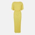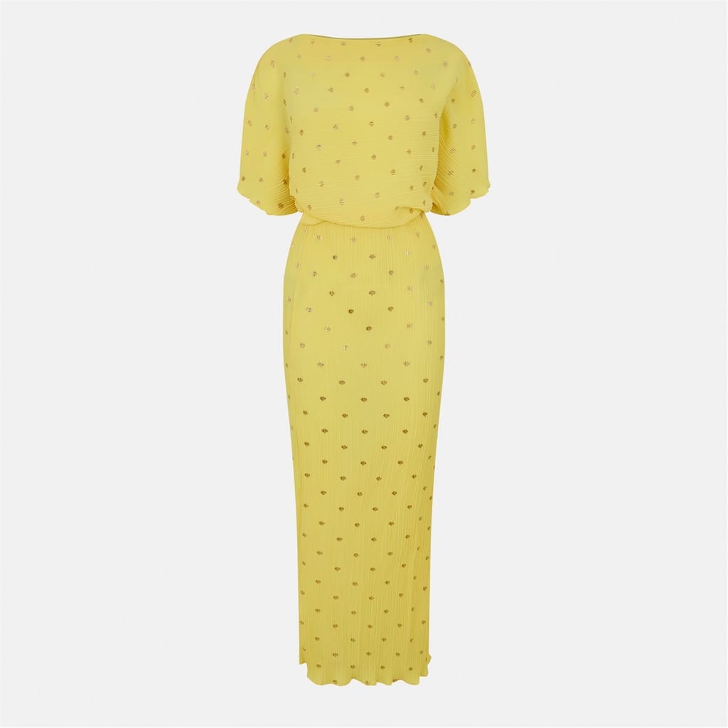 This Never Fully Dressed maxi dress is a stunning addition to your wardrobe. Featuring a classic polka dot pattern, it boasts a boat neck and puff sleeves for a touch of elegance. The A-line silhouette is enhanced with glitter embellishments, while the straight hemline completes the look. Perfect for making a statement at any event. -