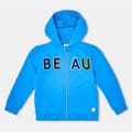 This Carrement Beau top from the outerwear and casual collections features a hooded neck and long sleeves with ribbed cuffs. The regular fit design is adorned with a logo applique and lettering graphic, adding a touch of style to its solid pattern. A convenient zipper closure completes the look. -