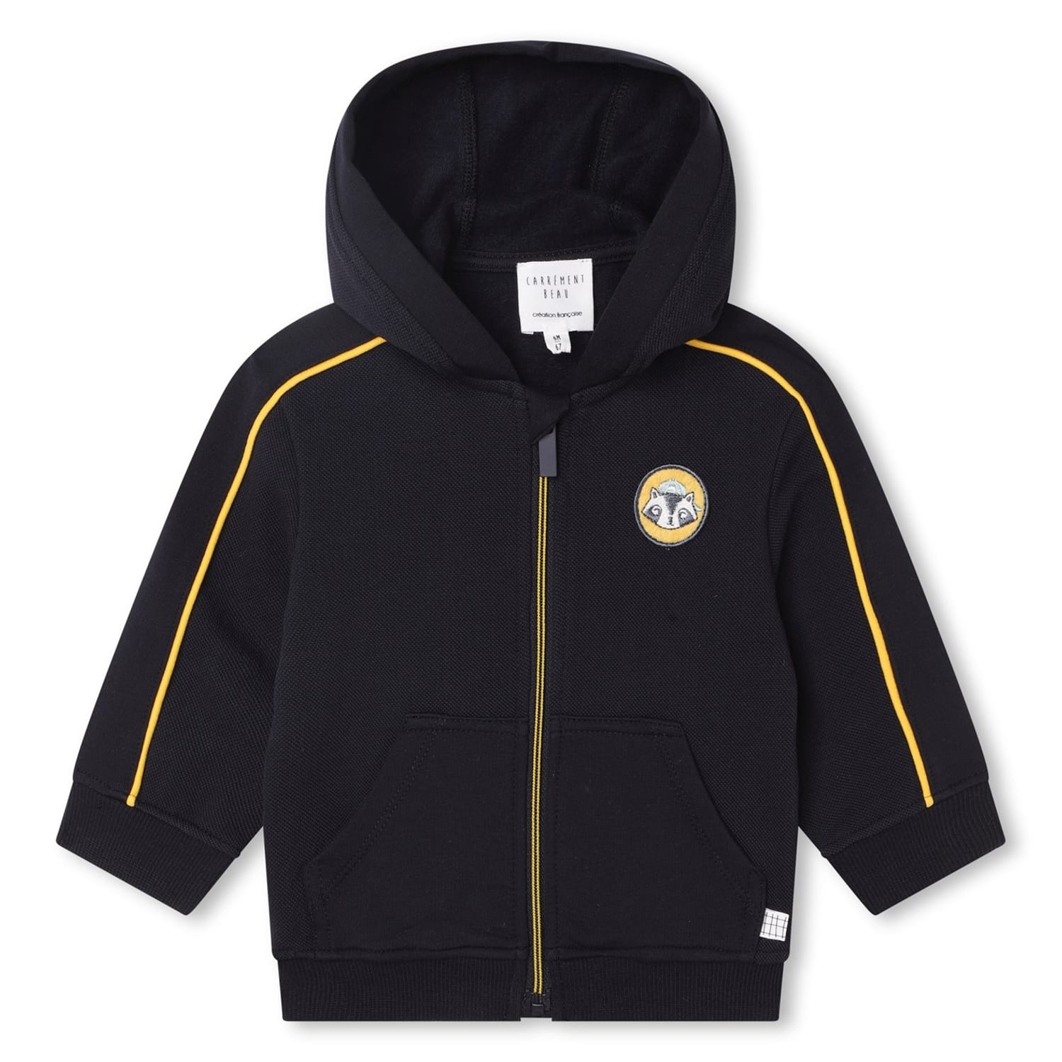 This Carrement Beau sweatshirt jacket is perfect for casual wear. It features a hooded neckline and a zipper closure for convenience. The jacket has a regular fit and a short length, complemented by ribbed cuffs and hem. The solid pattern is enhanced with a logo and practical pockets, making it a versatile addition to any wardrobe. -
