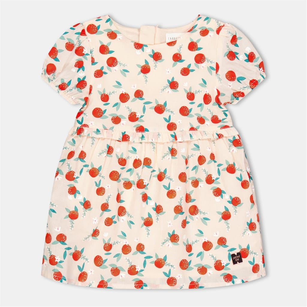 This Carrement Beau mini A-line dress features a playful fruit pattern and a classic crew neck. The short puff sleeves add a touch of charm, while the straight hemline ensures a neat finish. A subtle logo embellishment completes the look, making it a delightful choice for any occasion. -