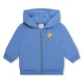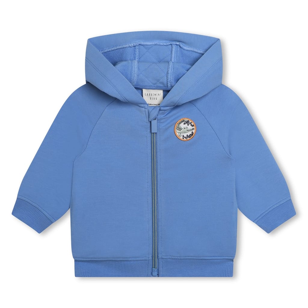 This Carrement Beau sweatshirt jacket features a hooded design with a zipper closure, offering a practical and stylish choice. The raglan sleeves and ribbed cuffs provide a comfortable fit, while the ribbed hem adds a neat finish. Embellished with a patch and logo, this solid-patterned jacket is a versatile addition to any wardrobe. -