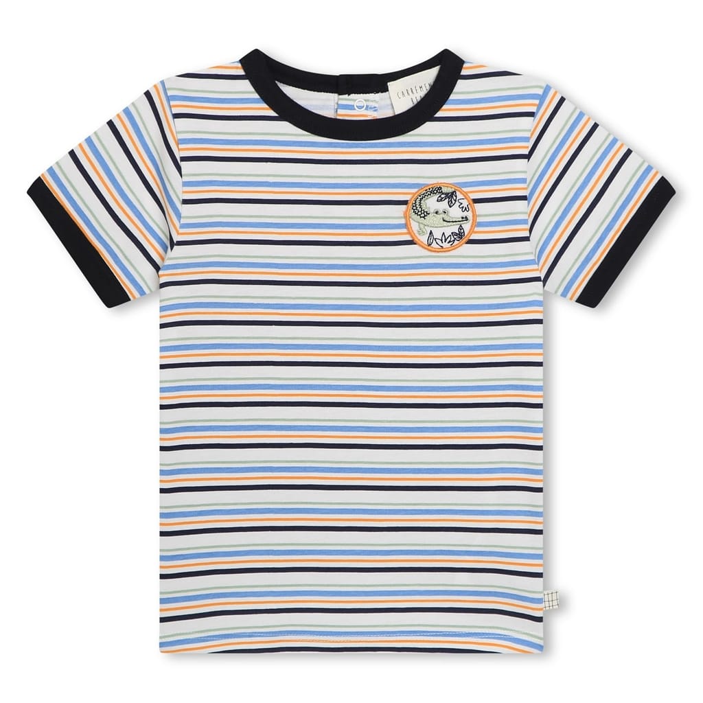 This Carrement Beau top features a regular fit with short sleeves and a crew neck. The design includes a ribbed collar and ribbed cuffs for added comfort. Adorned with a logo patch and a playful crocodile print, it also showcases a stylish horizontal stripe pattern, making it a distinctive choice for any wardrobe. -