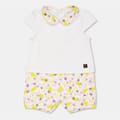 This Carrement Beau playsuit features a charming floral pattern and a collared neck. Designed with short plain sleeves, it offers a regular fit for comfort. The piece is adorned with a subtle logo embellishment, adding a touch of brand identity. -