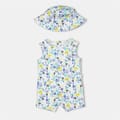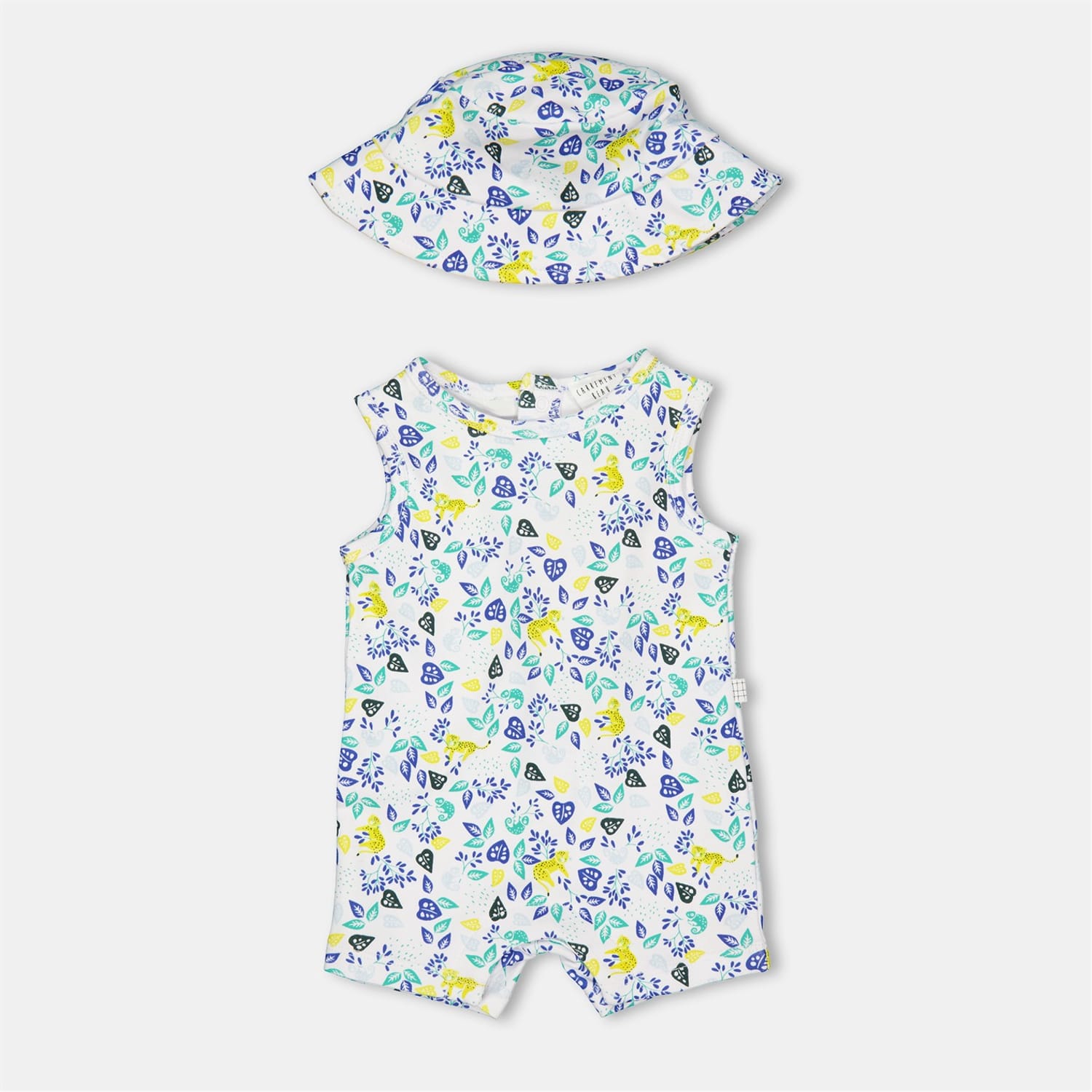 Discover the charm of Carrement Beau's floral romper, designed with a crew neck and sleeveless cut for a fresh look. This regular fit romper features practical pockets, adding a touch of functionality to its stylish design and including a leave printed bucket hat. Perfect for those seeking a blend of comfort and elegance in their wardrobe. -