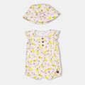 Discover the charm of Carrement Beau's floral playsuit, designed for a casual look. This sleeveless piece features a crew neck and ruffle sleeves, adding a touch of elegance and coupled with a bucket hat. The button closure ensures ease of wear, while the regular fit offers comfort. The ruffle embellishments enhance its playful style, making it a delightful addition to any wardrobe. -