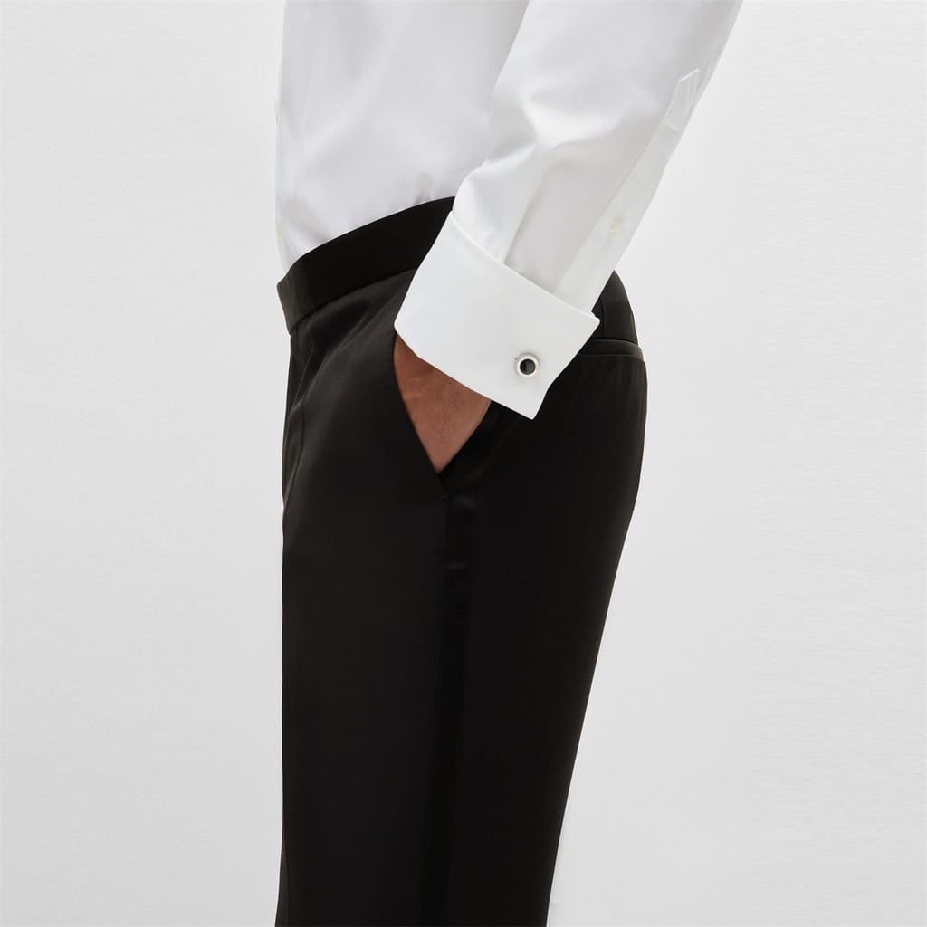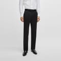 The Genius Tuxedo Trousers by BOSS are slim-fit and crafted from serge-woven wool for a refined and comfortable fit. They feature tonal silk-blend trims that add a touch of elegance and sophistication. Perfectly tailored for evening events, these trousers provide a sleek and polished look. Ideal for formal occasions where style and class are essential.