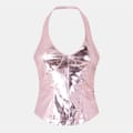 This Amylynn top features a striking metallic pattern and a halter neck design, perfect for adding a touch of glamour to your wardrobe. The sleeveless style and slim fit create a sleek silhouette, making it an ideal choice for those who appreciate contemporary fashion. -