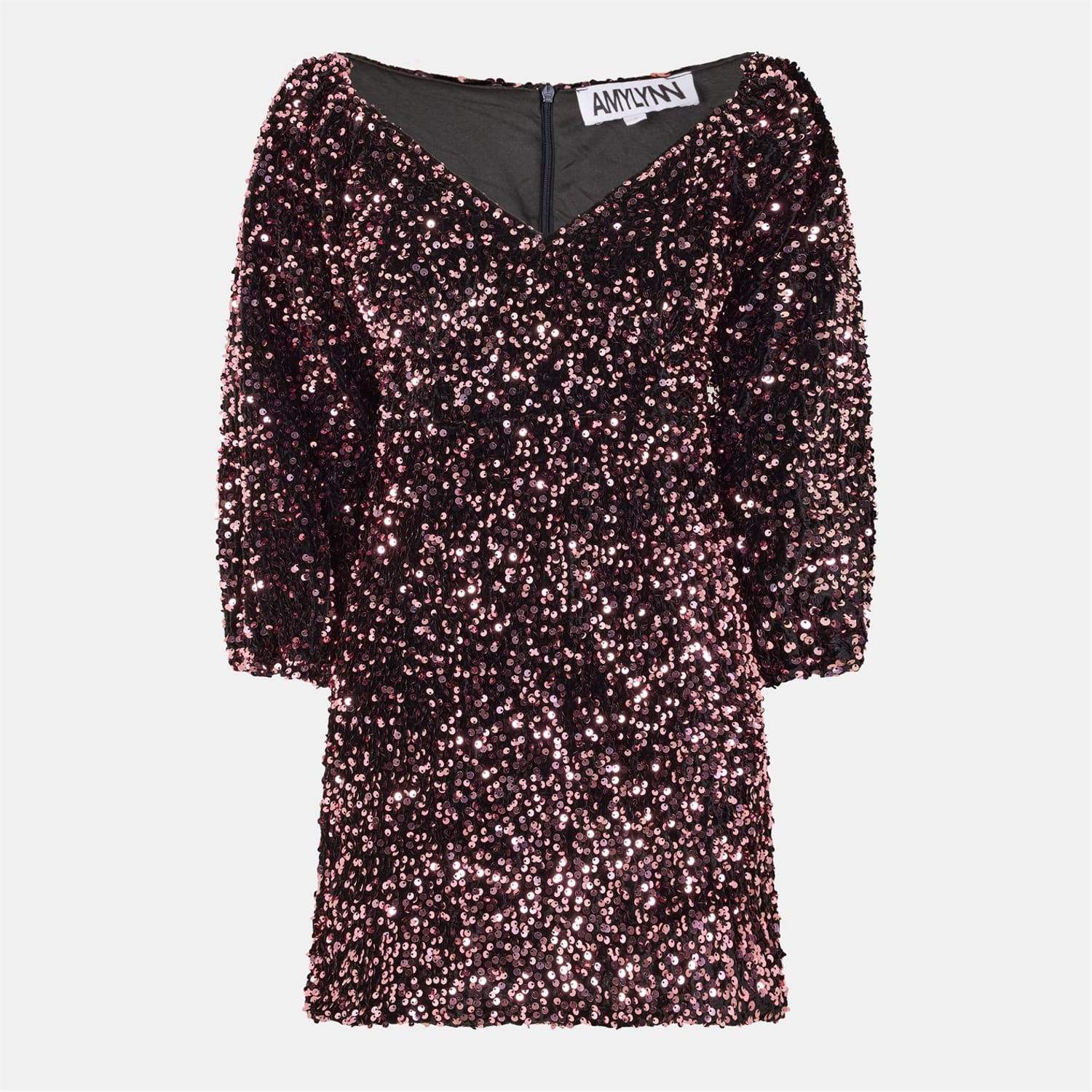 This Amylynn mini dress features a stylish V-neck and three-quarter puff sleeves, offering a chic and modern look. The dress is adorned with sequins, adding a touch of sparkle. It has a straight hem and a convenient zipper closure, ensuring a comfortable regular fit. Perfect for those seeking a blend of elegance and contemporary style. -