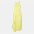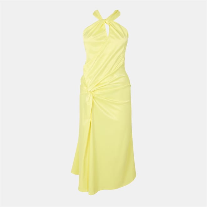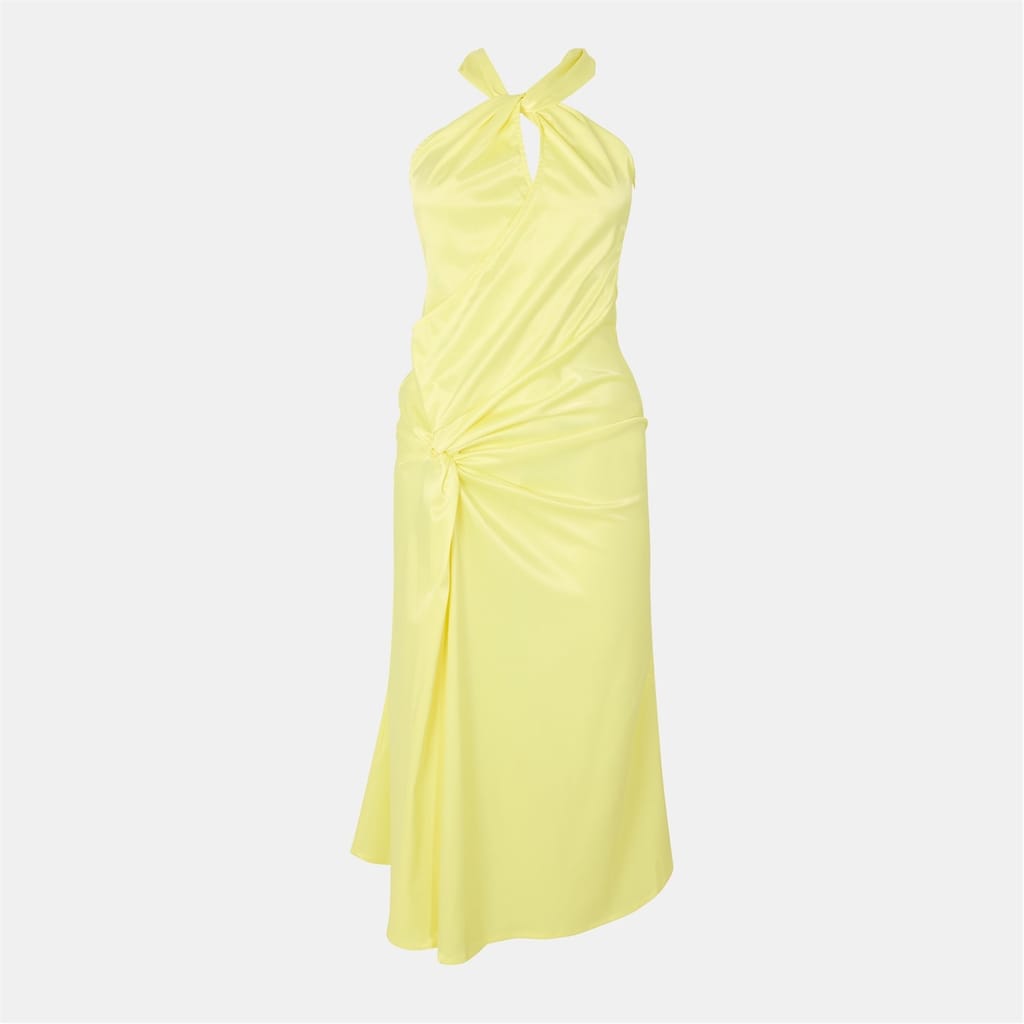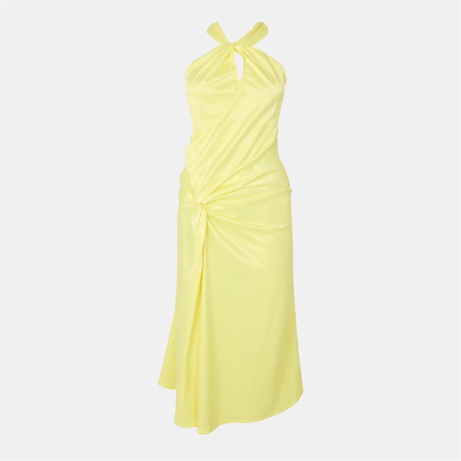 This Amylynn slip dress is a stunning maxi piece, featuring a halter neck and spaghetti straps for a chic look. The asymmetrical hem adds a touch of elegance, while the solid pattern and slim fit create a sleek silhouette. Perfect for any occasion, this dress embodies effortless style. -