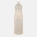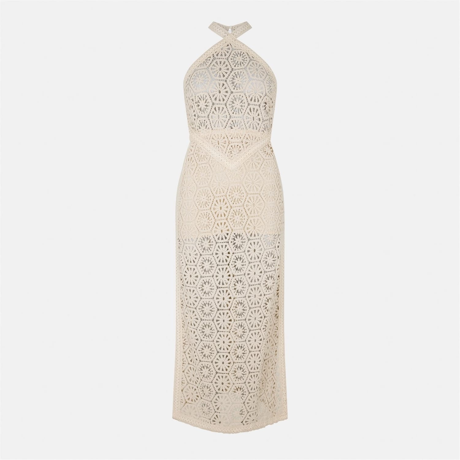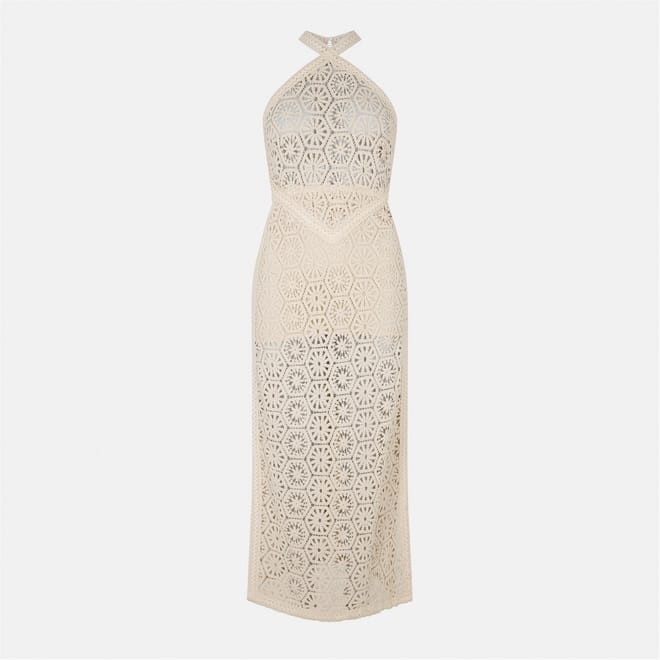 This Amylynn maxi sun dress features a halter neck and a slim fit, perfect for warm days. The dress is adorned with intricate crochet details, adding a touch of elegance. Its straight hemline and spaghetti straps enhance its stylish appeal, making it a standout piece for any occasion. -