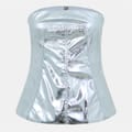This Amylynn top features a sleek sleeveless design with a metallic pattern that adds a touch of shine. The slim fit ensures a flattering silhouette, while the zipper closure at the back provides a modern touch. A metallic back tab embellishment completes the look, making it a standout piece for any wardrobe. -