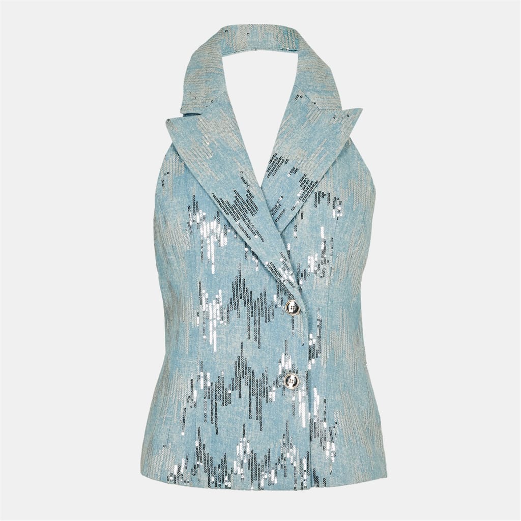 This formal waistcoat features a halter neck and a shawl collar, offering a sophisticated touch. The slim fit and short length create a sleek silhouette, while the button closure ensures a secure fit. Adorned with geometric patterns and sequin embellishments, this piece is perfect for adding a touch of elegance to any formal occasion. -