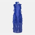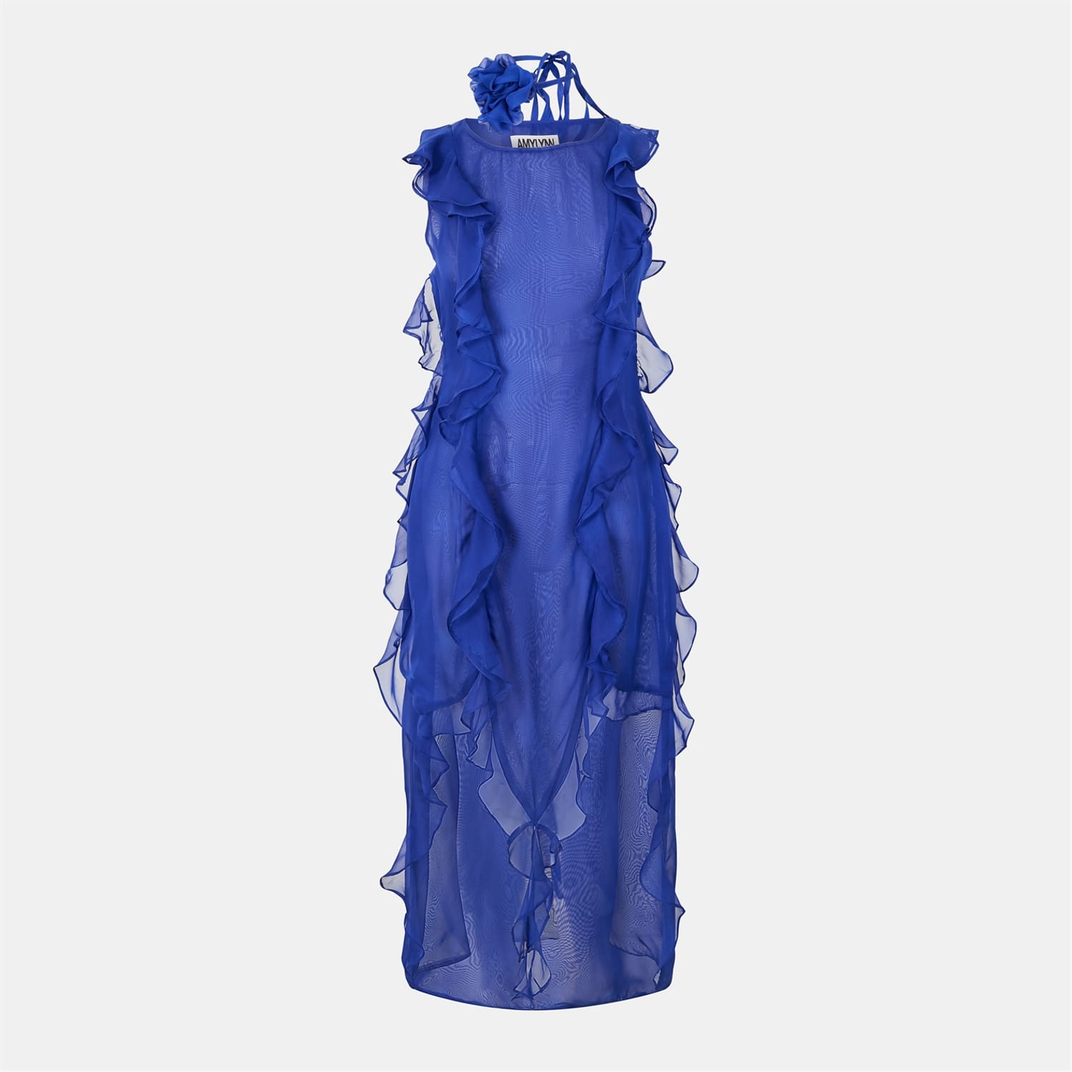 This Amylynn maxi tiered dress features a halter neck and a ruffle hem, offering a sophisticated silhouette. The solid pattern enhances its elegant appeal, while the tie closure adds a touch of practicality. The dress is adorned with ruffles, adding a playful element to its design. -