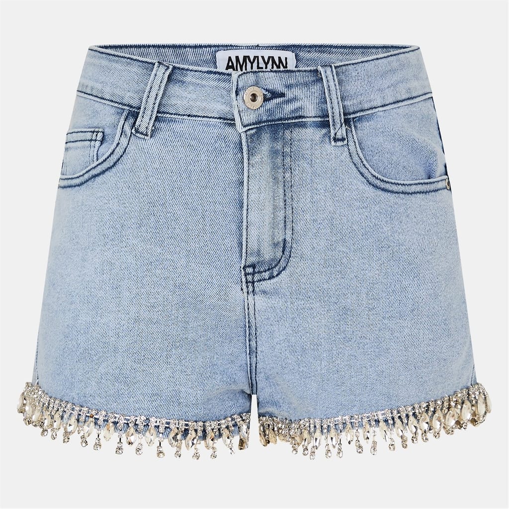 Discover the Amylynn jean shorts, a perfect blend of style and comfort. These solid casual shorts feature a slim fit, enhanced with rhinestone embellishments, pockets, and fringe detailing. The button and zip fly closure ensures a secure fit, making them a versatile addition to your wardrobe. -