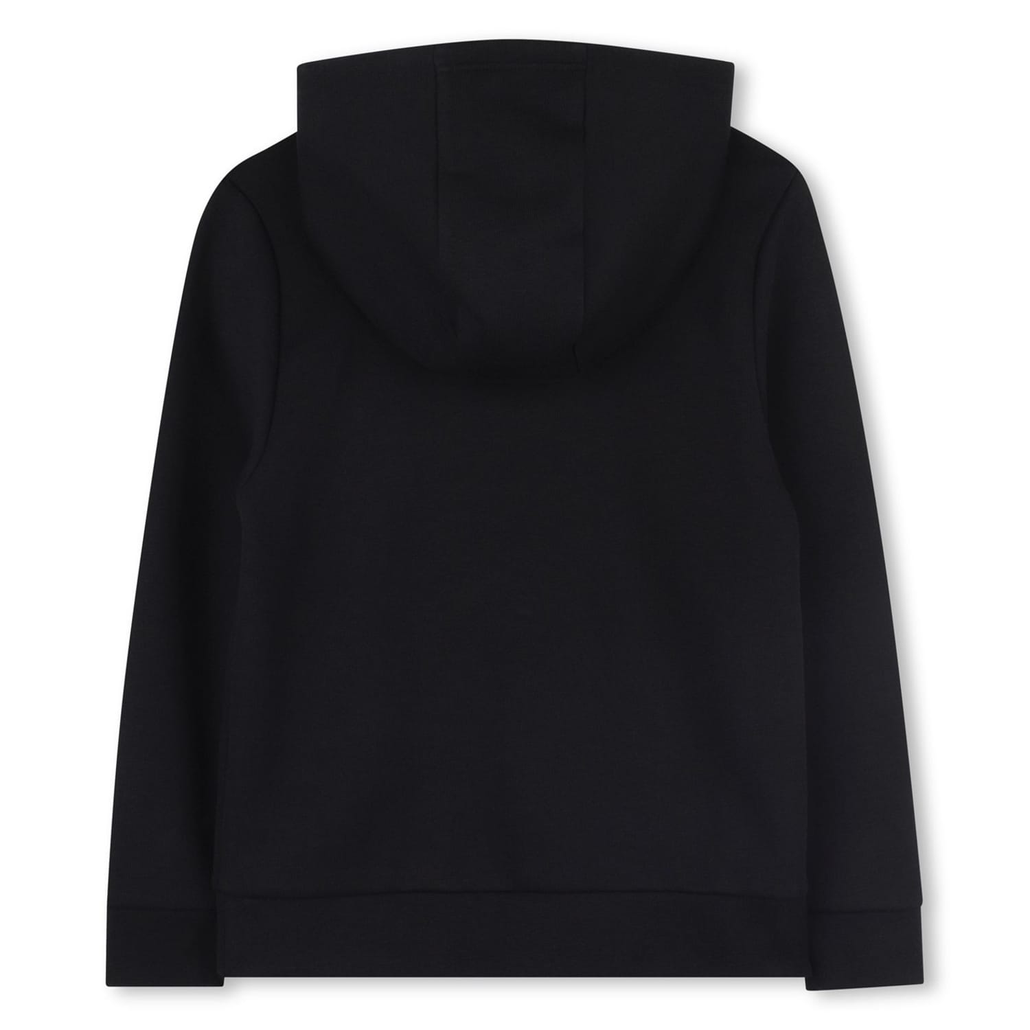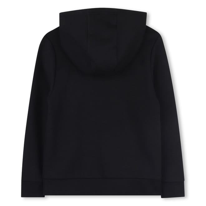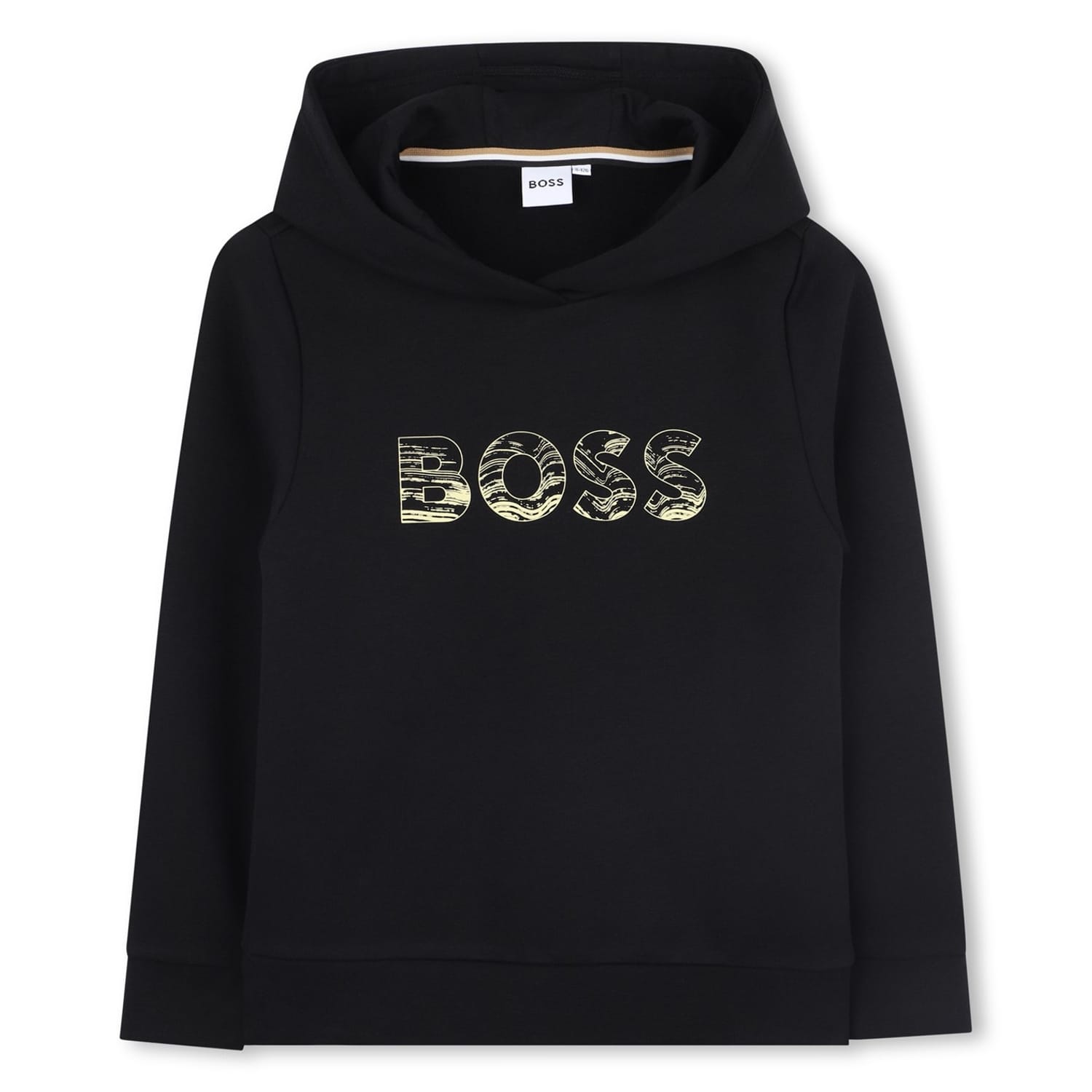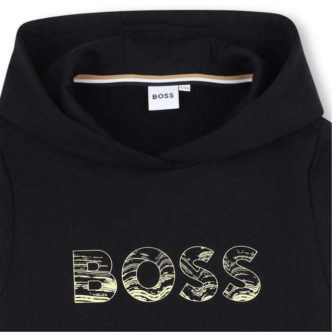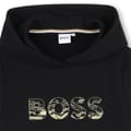 This Boss top features a hooded neck and long sleeves, offering a regular fit. The design includes a graphic print with lettering and a logo embellishment. Ribbed cuffs add a touch of detail to this stylish piece. -