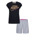 This Nike top short set is perfect for activewear enthusiasts. The set includes a crew neck t-shirt with short sleeves and a plain sleeve style, featuring a large genie graphic print and logo embellishment. Paired with athletic bermuda shorts, this knit set offers a comfortable and stylish option for casual outings. -