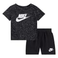 This Nike top short set combines a graphic print t-shirt with athletic bermuda shorts for a casual style. The t-shirt features a crew neck and plain short sleeves, adorned with a large genie graphic and logo embellishment. Perfect for those seeking a comfortable and stylish ensemble. -