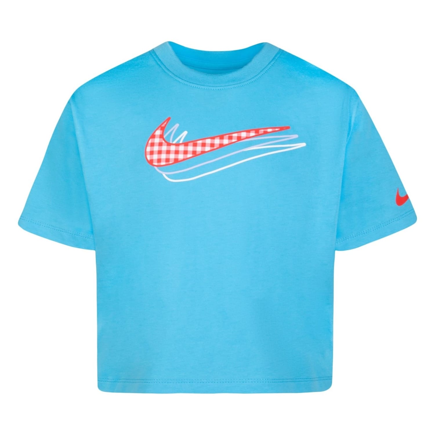 This Nike cropped top is a casual essential, featuring a gingham pattern and a crew neck. The short sleeves and regular fit ensure comfort, while the logo embellishment adds a touch of brand identity. -