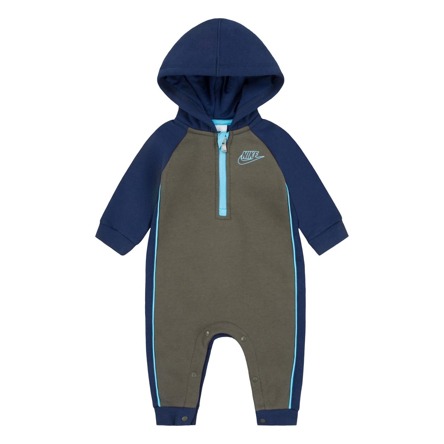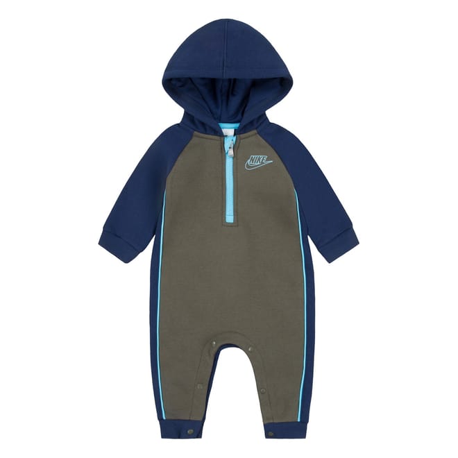 This Nike jumpsuit features a hooded neck and raglan long sleeves, offering a comfortable regular fit. The design includes a snap and zipper closure for convenience. Embellished with the iconic logo, this bodysuit is a stylish addition to your wardrobe. -
