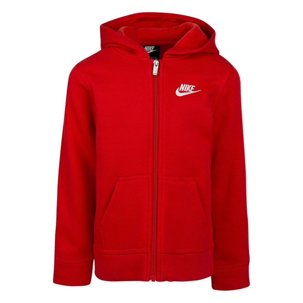 This Nike infant sweatshirt jacket features a hooded design with a full zipper closure. The regular fit ensures comfort, while the ribbed cuffs and straight hem provide a neat finish. The solid pattern is complemented by a logo embellishment, adding a touch of brand identity. -
