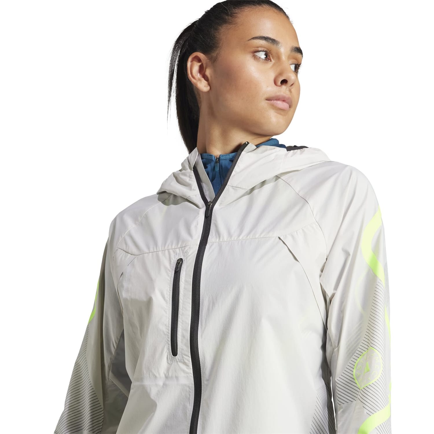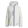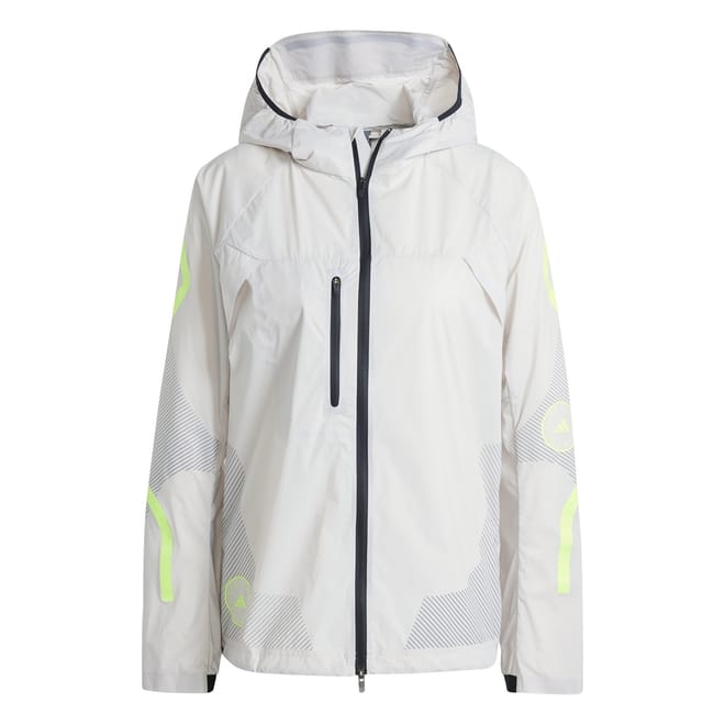 This adidas running jacket is designed for performance with a hooded neckline and a regular fit. It features a zipper closure and a straight hem. The jacket is embellished with a front logo, zipped and side pockets, contrast details, and a toggle cord hem. The striped pattern adds a stylish touch to this short-length jacket, making it a practical choice for active wear. -
