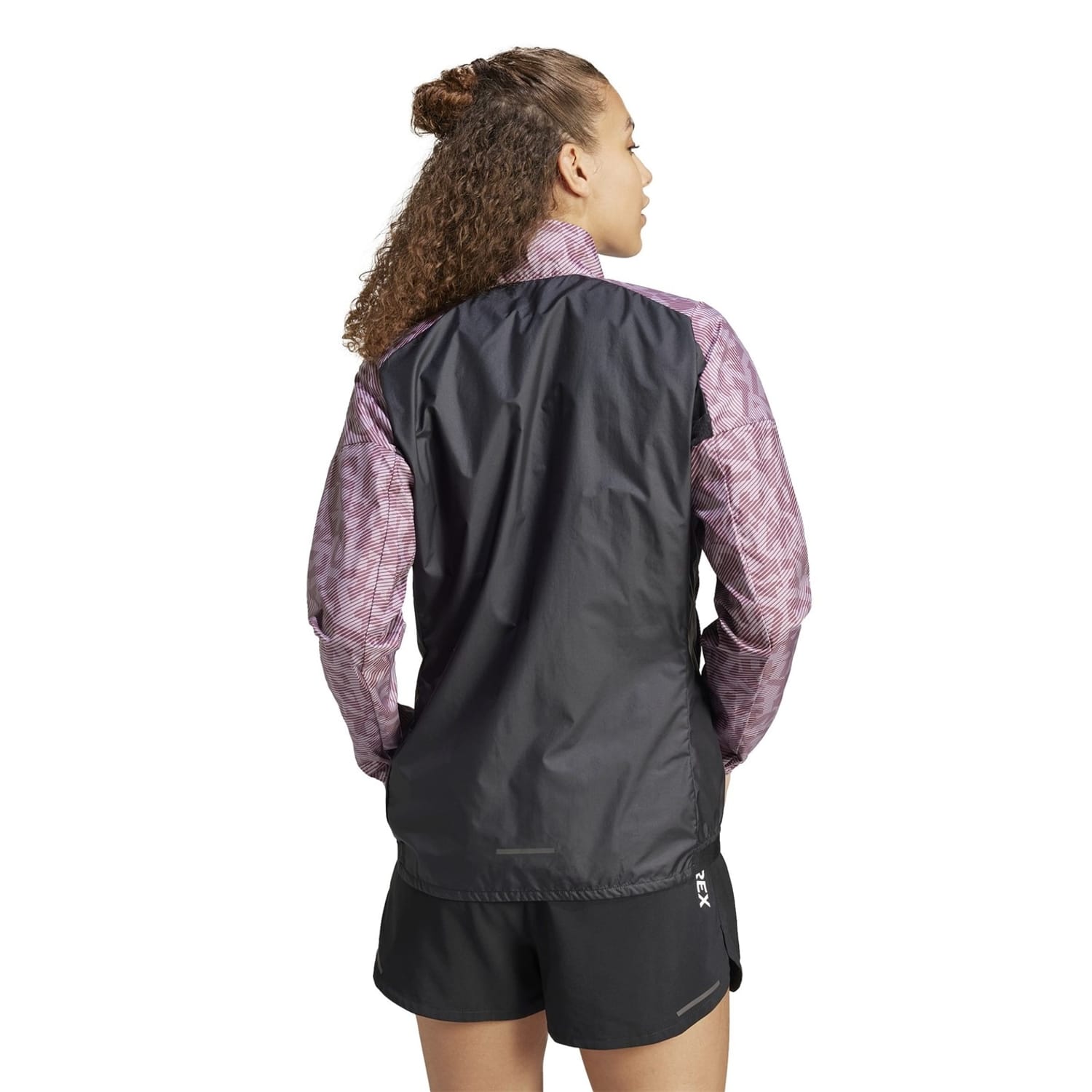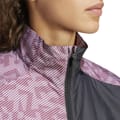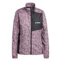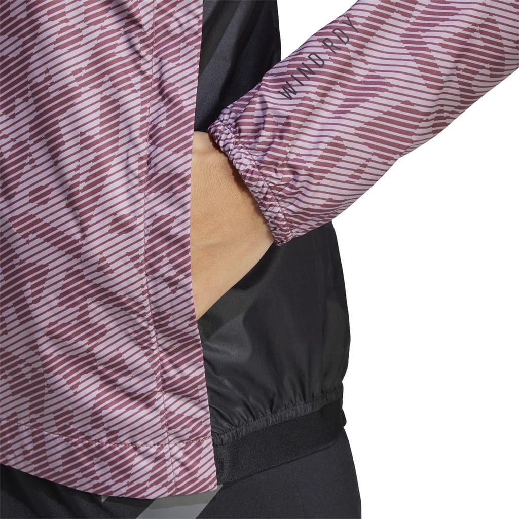 The adidas trail jacket is designed for performance with a regular fit and a geometric pattern. It features a zip neck and a zipper closure, complemented by an elasticated cuff and a straight hem. The jacket is adorned with a logo, making it a stylish choice for sporting activities. -