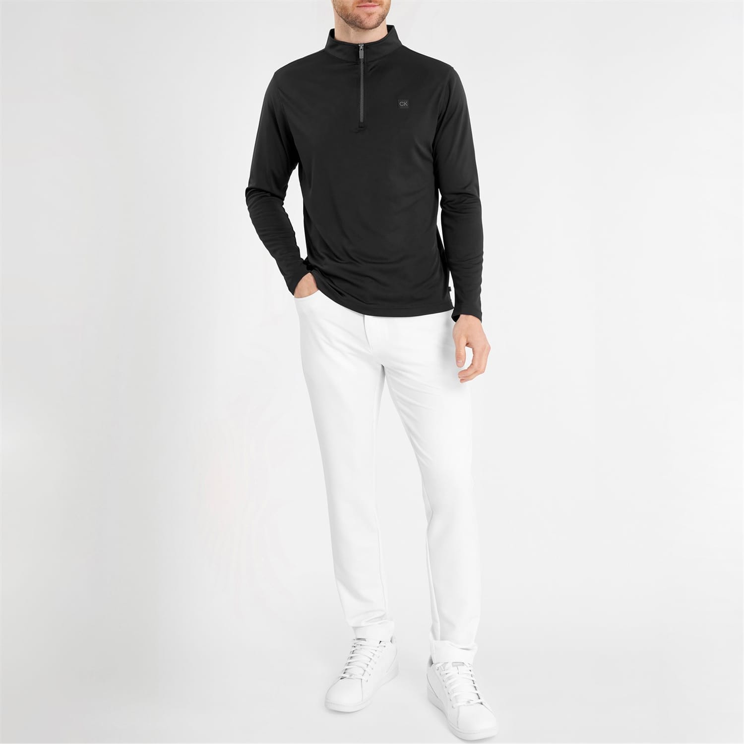 This Calvin Klein Golf top is a perfect addition to your activewear collection. Featuring a zip neck and long sleeves, it offers a regular fit for comfort. The solid pattern and subtle logo embellishment add a touch of style to this versatile piece. -