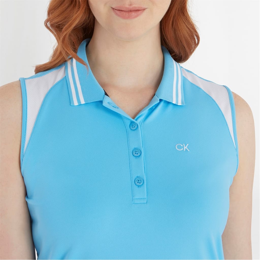 This Calvin Klein Golf top is designed for performance with a solid pattern and a sleeveless design. It features a polo collar and a button closure, offering a sleek and functional look. The top is embellished with a logo, adding a touch of brand identity. -