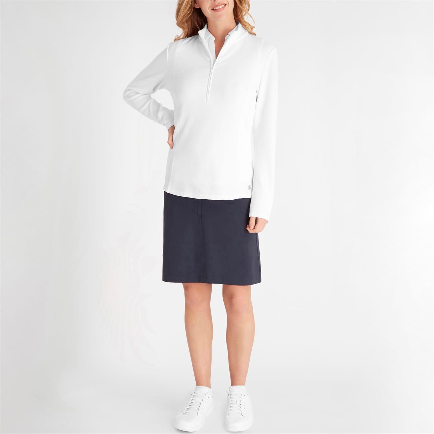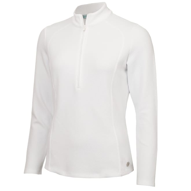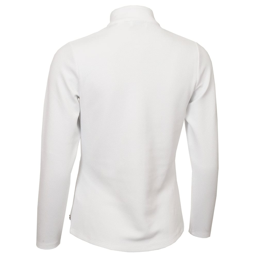 This Calvin Klein Golf top features a zip neck and long sleeves, offering a regular fit. The solid pattern is complemented by a subtle logo embellishment, adding a touch of brand identity. -