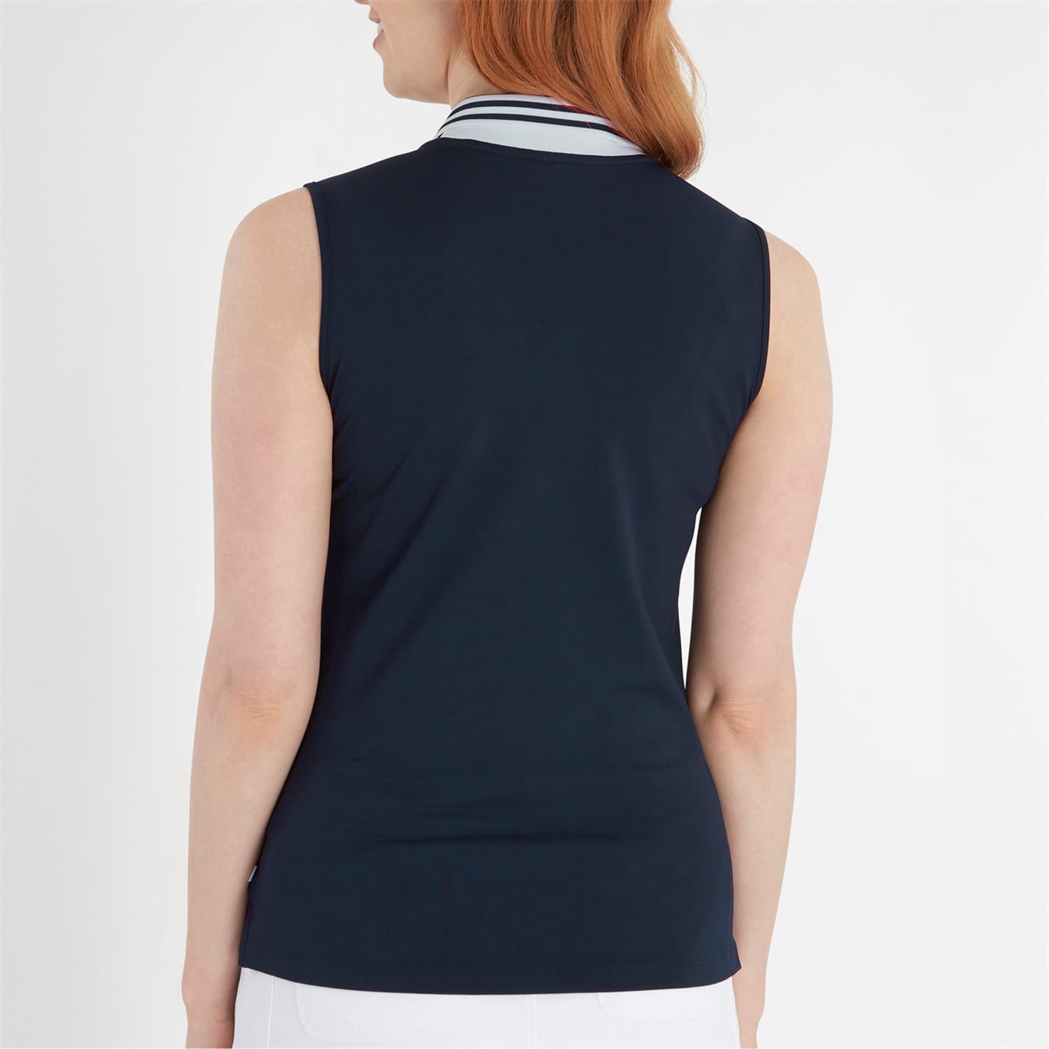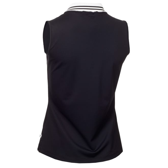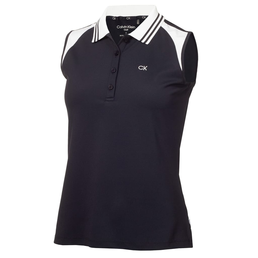 This Calvin Klein Golf top is designed for performance with a sleek, sleeveless style. It features a polo collar and a button closure, offering a slim fit for a modern look. The solid pattern is complemented by a subtle logo embellishment, making it a versatile addition to any wardrobe. -
