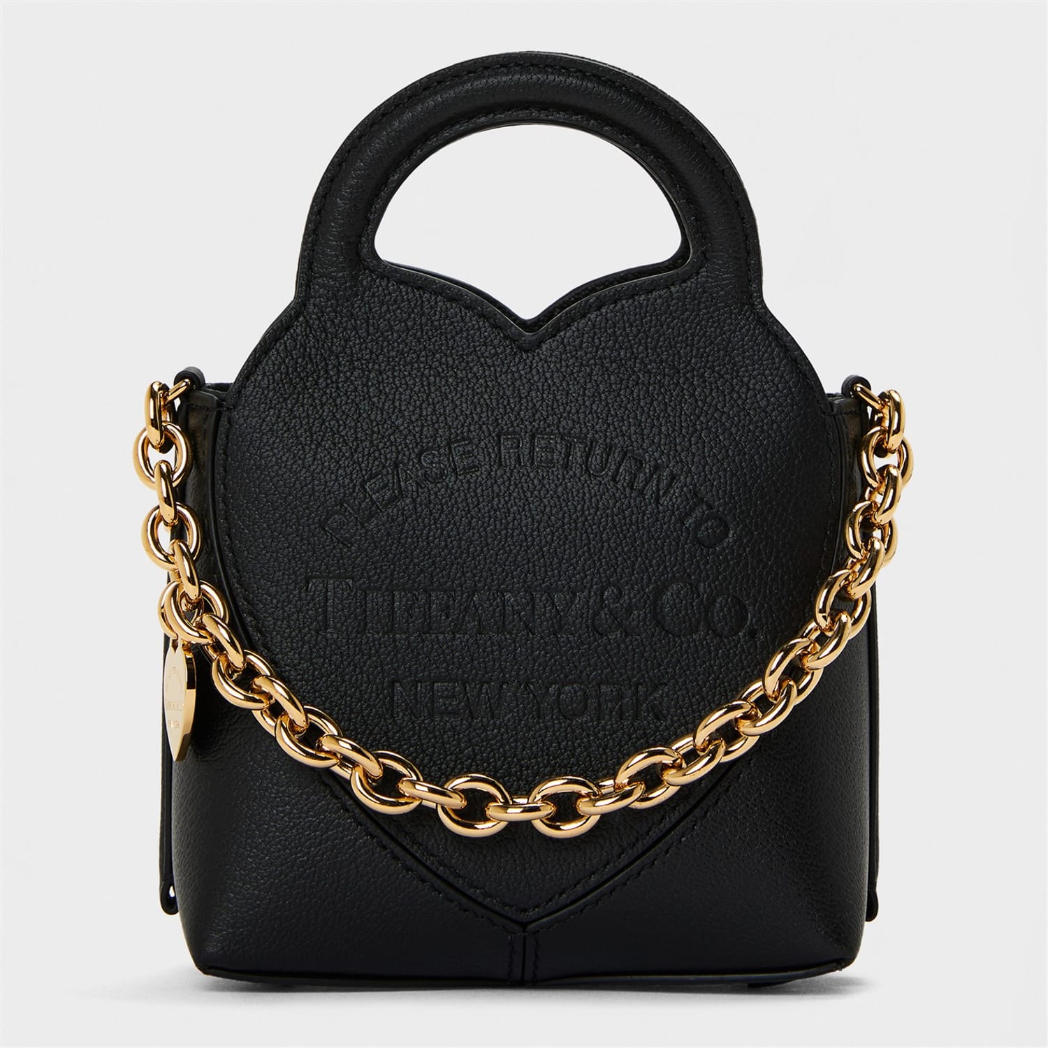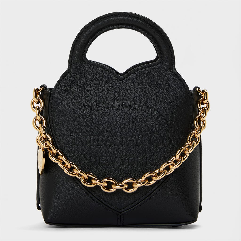 Discover the elegance of Tiffany with this tote bag, featuring a snap button closure and a top handle for easy carrying. Adorned with a logo and chain embellishments, this bag combines style and functionality, making it a perfect accessory for any occasion. -