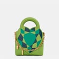 Discover the elegance of Tiffany's tote bag, featuring a geometric pattern and adorned with a charm and chain embellishment. This stylish accessory is designed with a top handle, making it both functional and fashionable for any occasion. -