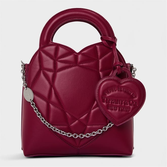 Discover the Tiffany tote, a stylish addition to your collection. This padded bag features a top handle for easy carrying and a secure snap button and zipper closure. Adorned with a charming heart graphic and logo embellishment, it combines elegance with functionality. -