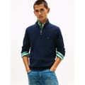 This Tommy Hilfiger top features a stylish horizontal stripe pattern and a chest logo. Designed with a zip neck and high collar, it offers a regular fit for comfort. The long sleeves are complemented by ribbed cuffs, while the ribbed hem adds a touch of detail. The quarter zipper closure enhances its modern appeal. -