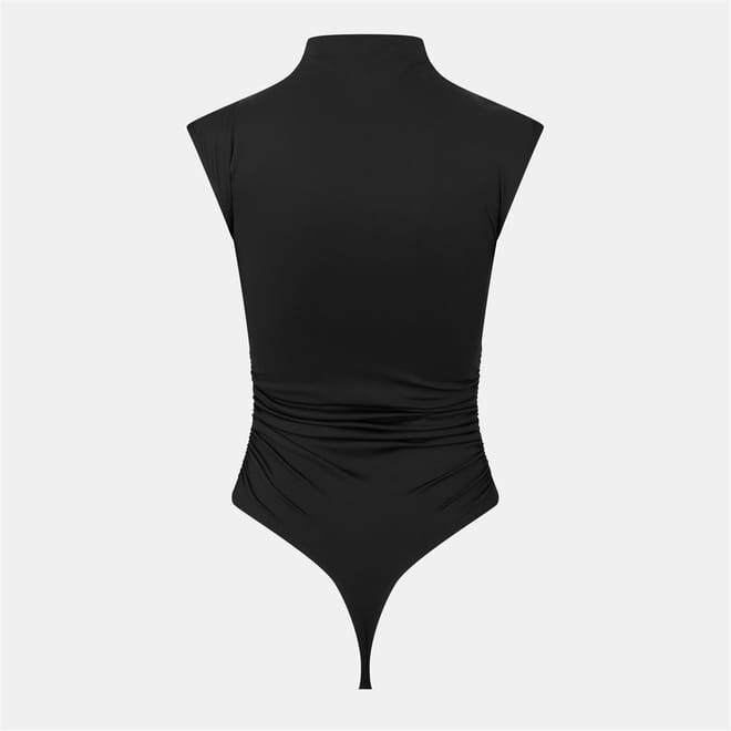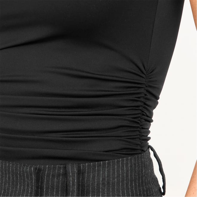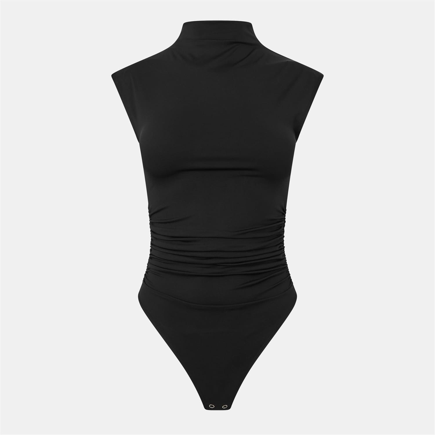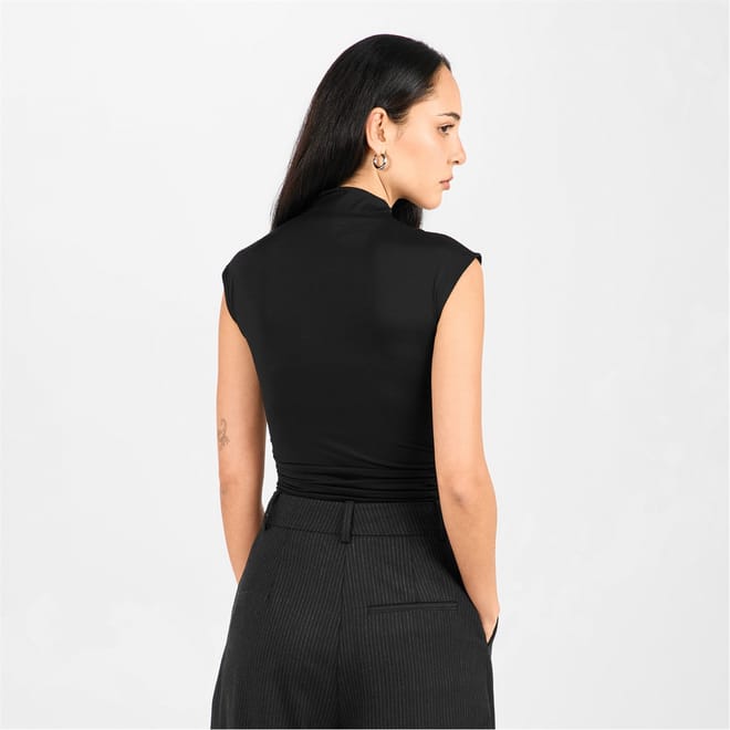 Discover the sleek design of Good American's sleeveless top, featuring a high collar and a mock neck. This slim fit piece is enhanced with a ruched embellishment, offering a modern twist to its solid pattern. The cap sleeve style and clean hemline add to its refined appeal, while the snap closure ensures a secure fit. -