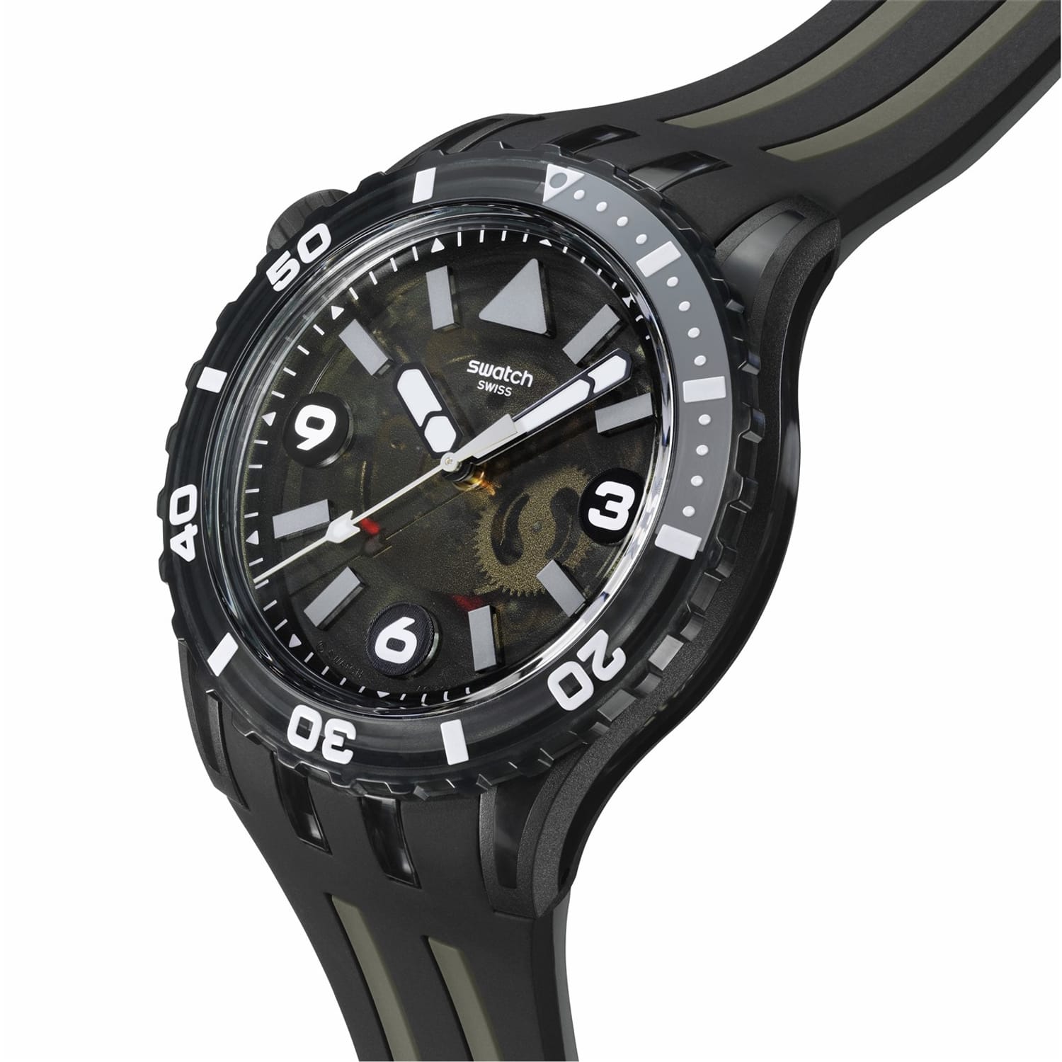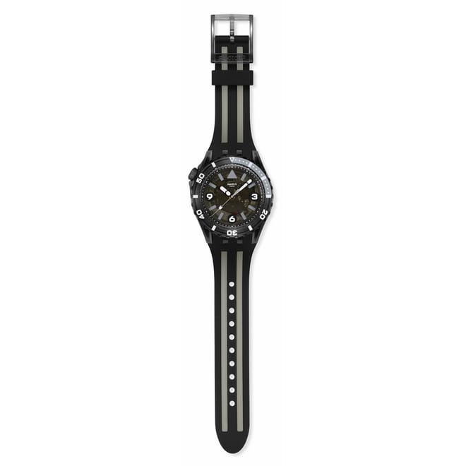 Discover the Swatch wrist watch, a perfect blend of style and functionality. This casual timepiece features an intense black dial, offering a striking contrast against its durable rubber strap. With an analogue display, it provides a classic touch to your everyday look. Ideal for those who appreciate simplicity and elegance in their accessories. -