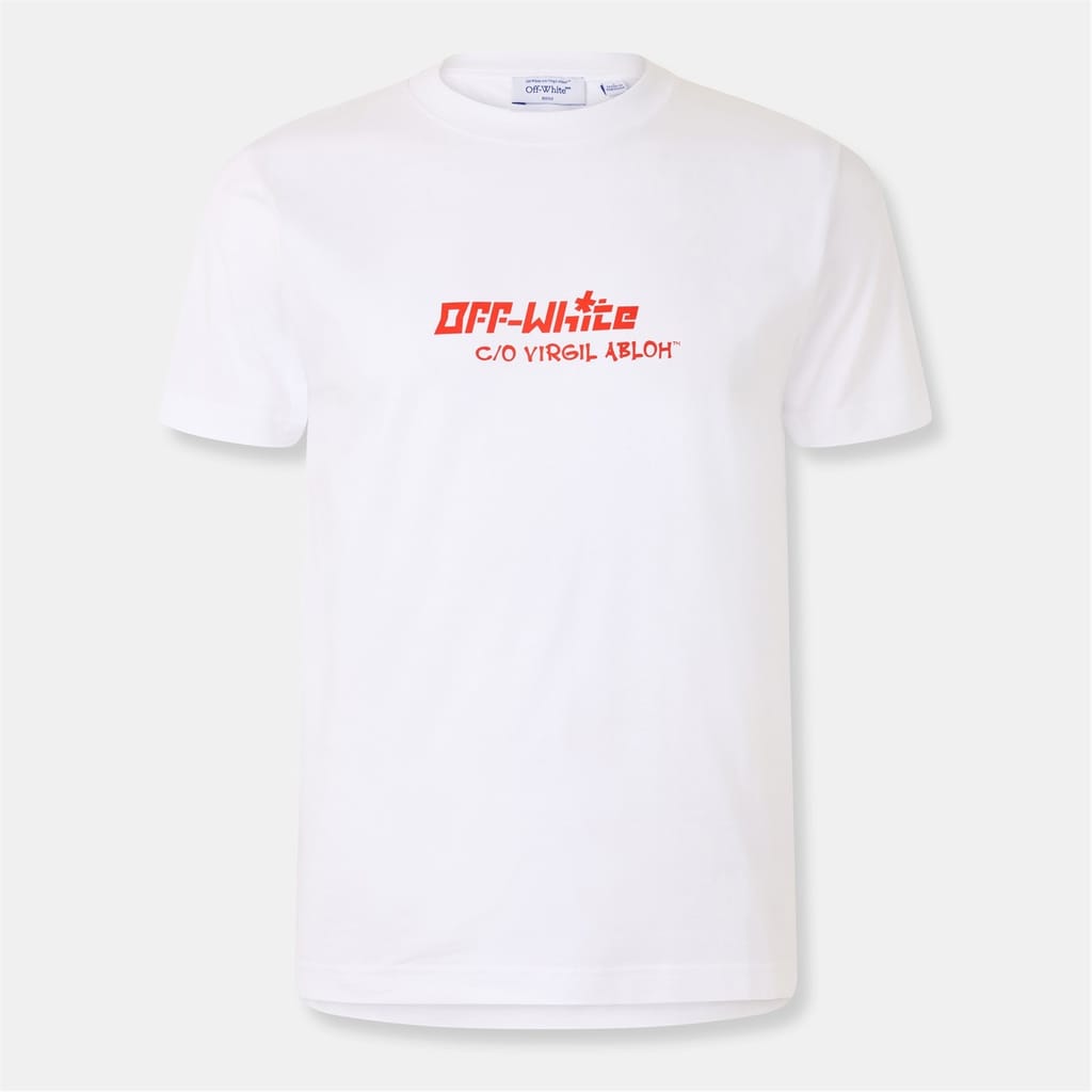 This Off White top features a regular fit with a crew neck and short sleeves. The graphic print is enhanced by distinctive lettering and a logo embellishment, making it a standout piece in any casual collection. -