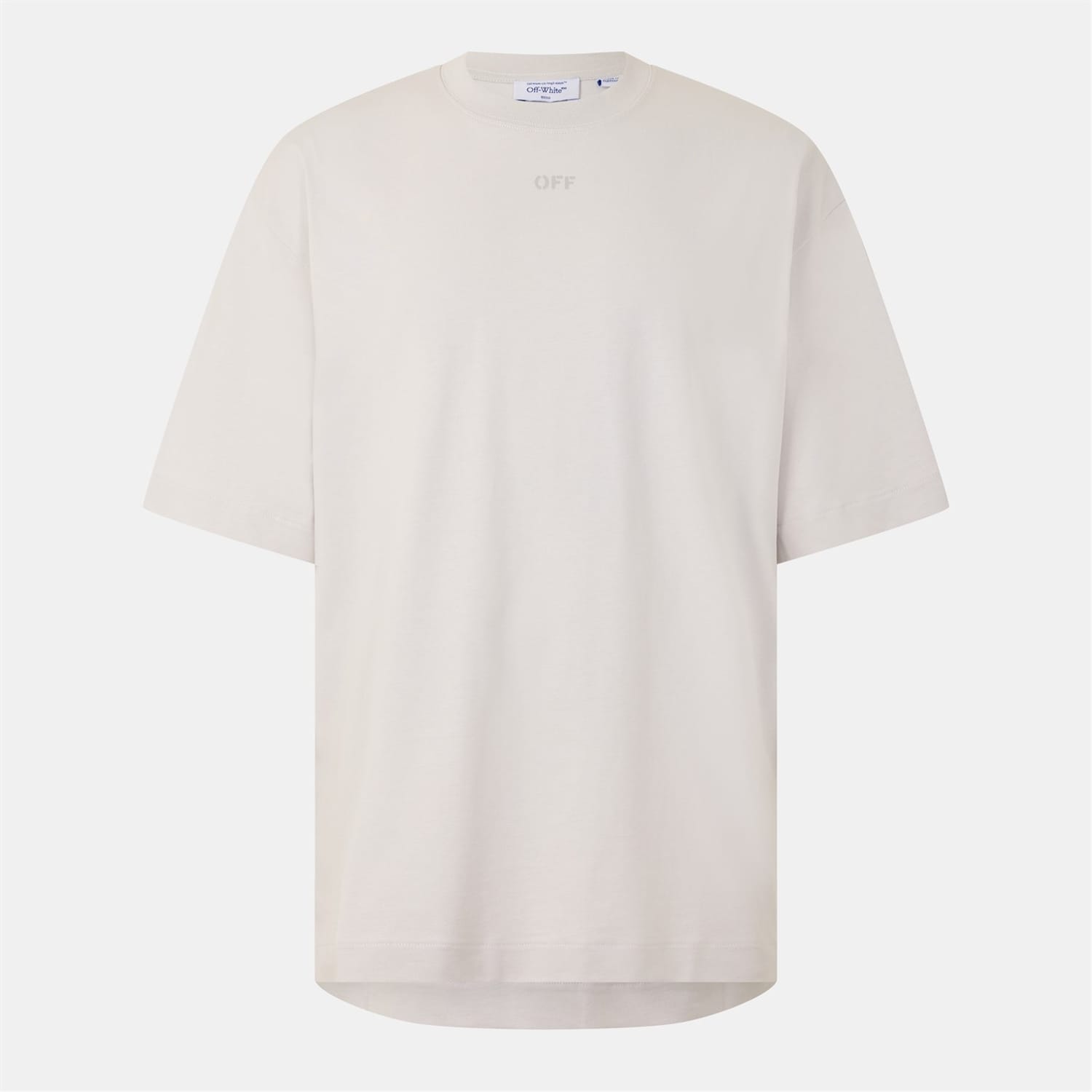 This Off White top features a regular fit with a crew neck and short sleeves. The solid pattern is complemented by a distinctive logo embellishment and lettering graphic, adding a unique touch to the design. -
