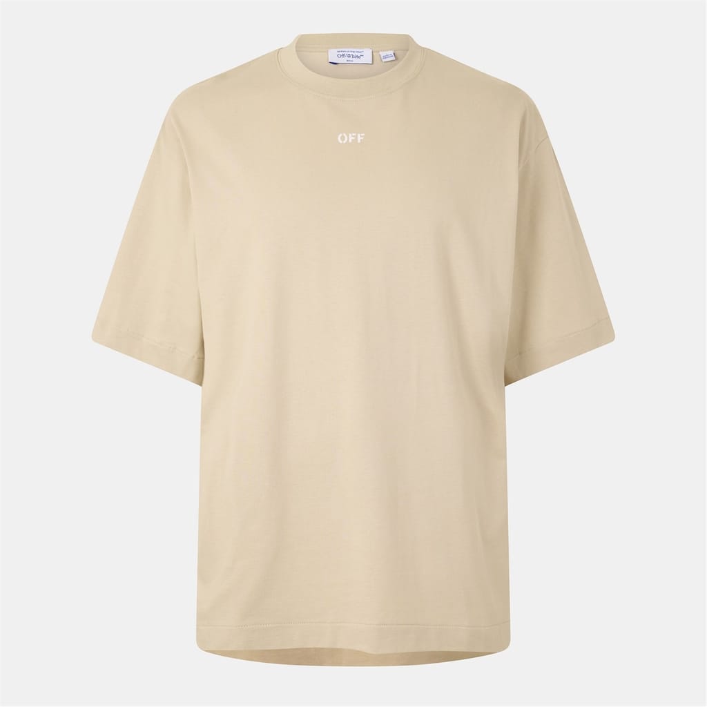 This Off White top features a regular fit with a crew neck and short sleeves. The solid pattern is complemented by a distinctive logo embellishment and lettering graphic, making it a standout piece in any casual collection. -