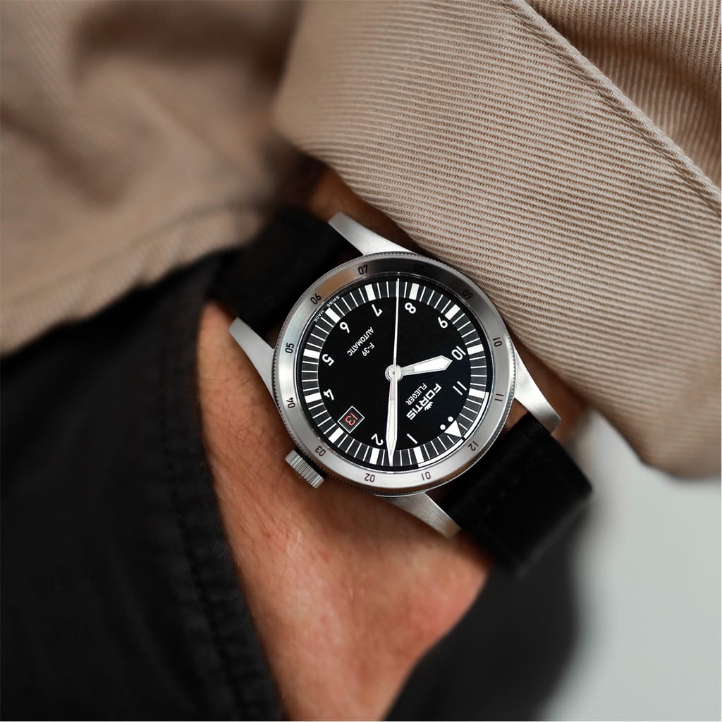 Fortis's Flieger Strap Auto Analogue Watch embodies aviation heritage with its pilot design. The timepiece features functional precision and aesthetics, set on a durable strap that delivers both comfort and reliability.