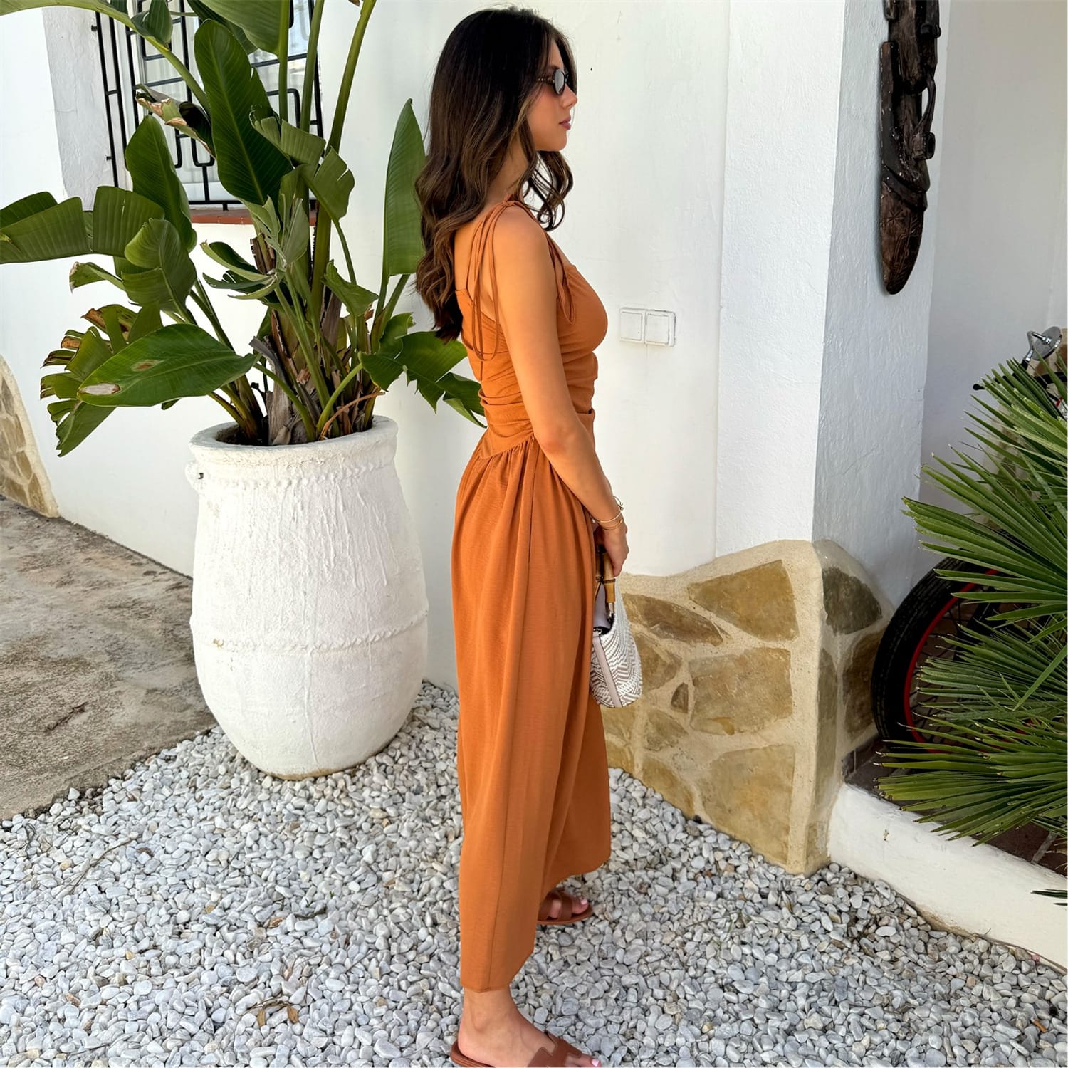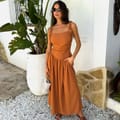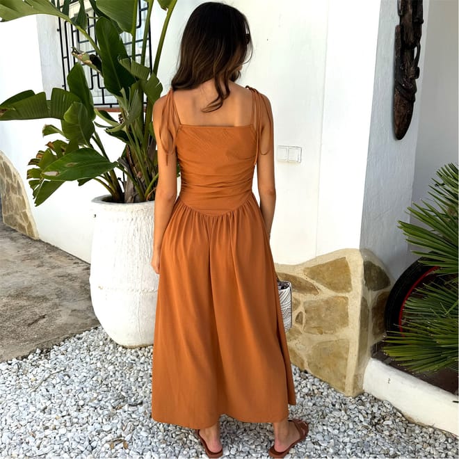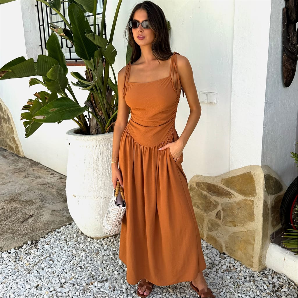 Our Drawstring Tie Straps Ruched Top Midi Dress is a summer wardrobe essential. This gorgeous dress features drawstring tie straps, ruched top sides, a straight neckline and a midi skirt with hidden pockets. Wear it with sandals or wedges for a super cute holiday look.