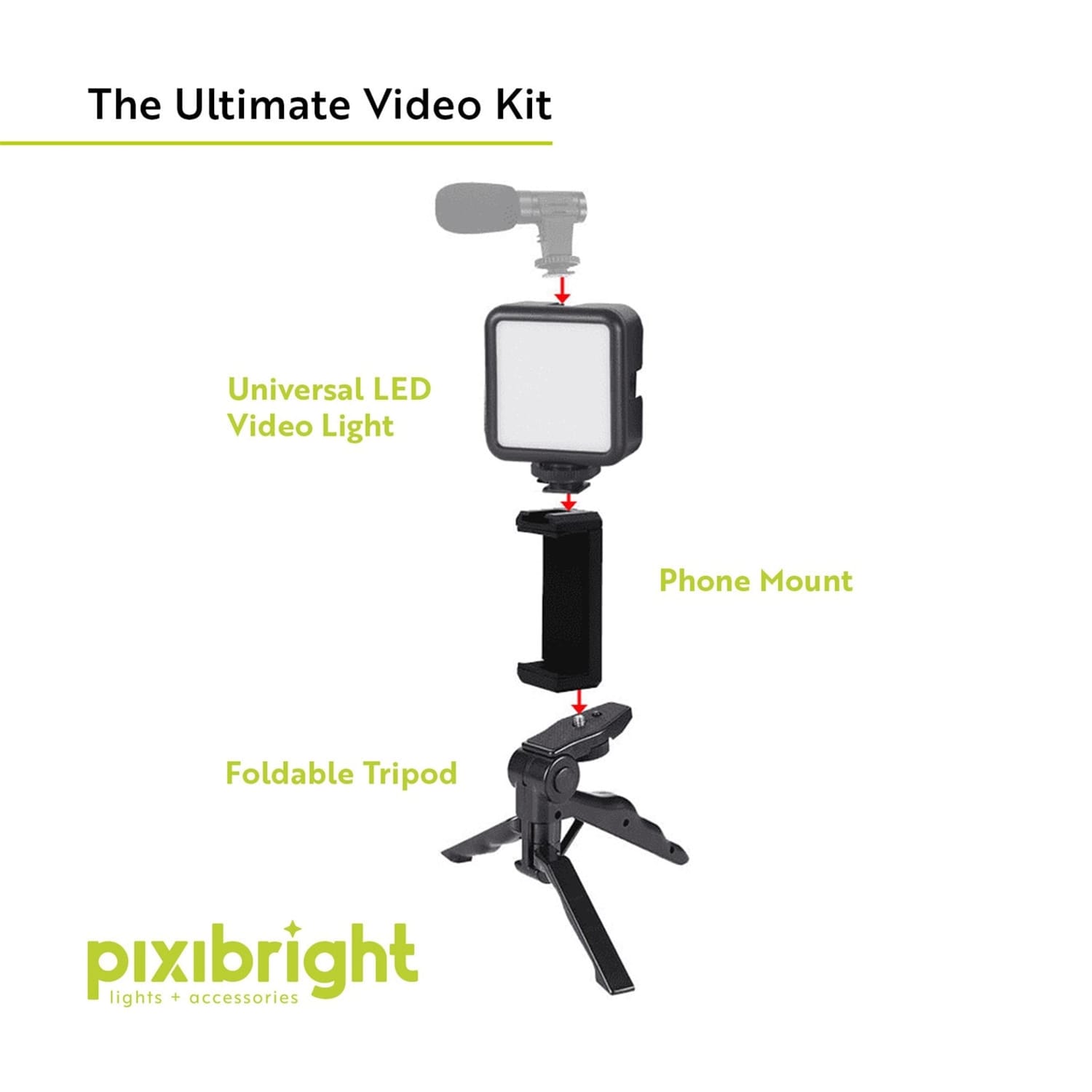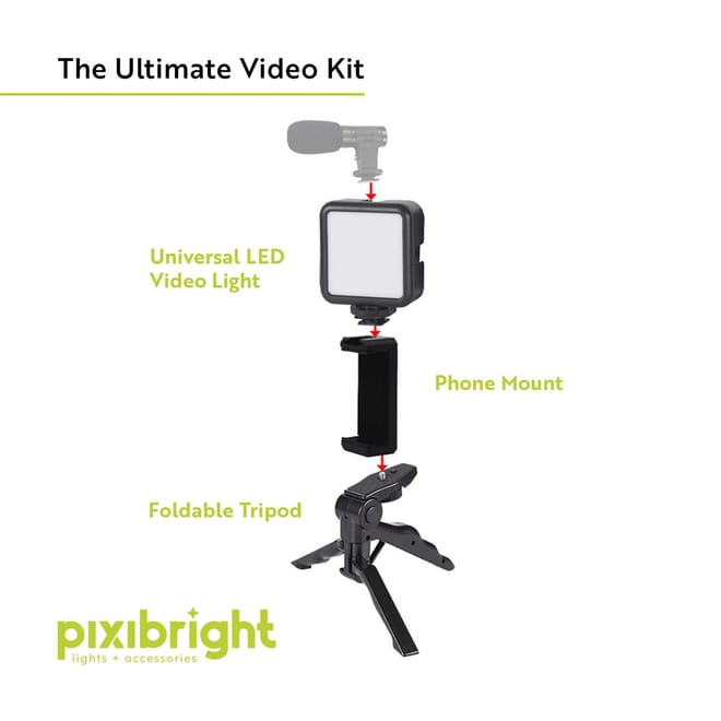 The Pixibright Video Making Kit is the ultimate companion for content creators, vloggers, and photography enthusiasts who want to capture stunning visuals. This versatile kit includes a powerful 600 lumens LED video light that ensures your videos and photos are always well-lit, no matter the environment. With adjustable brightness settings, you can customize the lighting to achieve the perfect look for your content. The universal smartphone holder securely fits most smartphones, allowing you to record and stream hands-free with ease. The foldable tripod adds stability and portability to the kit, making it perfect for both at-home setups and on-the-go shoots. Whether you're recording videos, streaming live, or taking professional-looking photos, the Pixibright kit offers the flexibility and performance you need to enhance your content creation. Compact, lightweight, and easy to set up, this kit is ideal for vloggers, streamers, and creators who want to take their video-making to the next level. Create with confidence using Pixibright! -